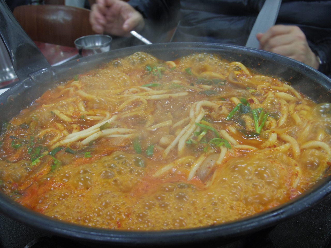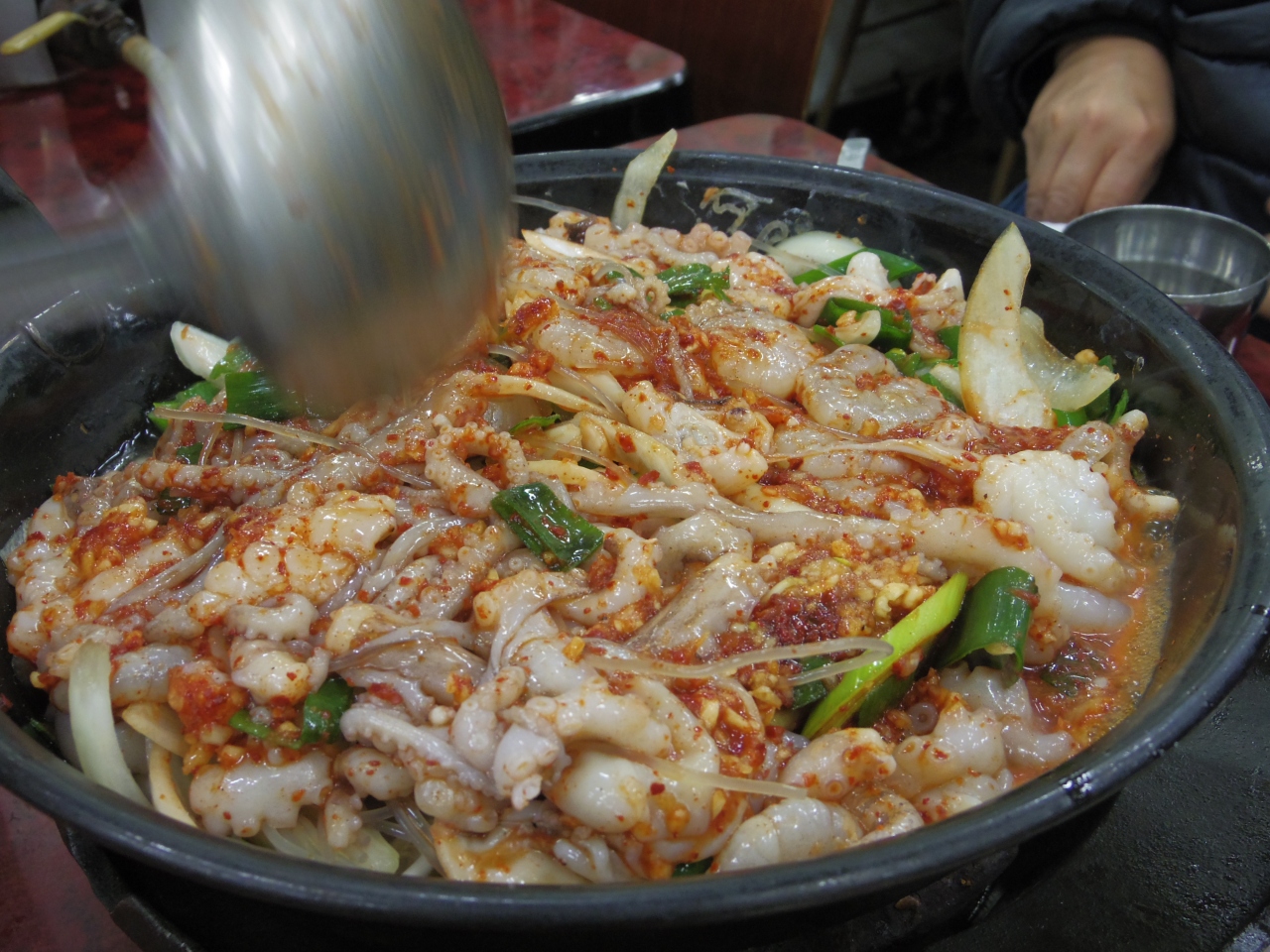 ナクチポックンというと、酒のつまみのタコの辛い炒め物だけど、釜山のナクチポックンは鍋みたいな感じ。タコと海老のミックスを注文、一人前W6500(500円強)でご飯付。にんにくがどっさり。