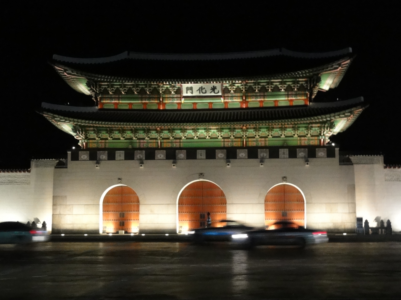 李朝正宮・景福宮正門‘光化門’夜間ライトアップされ美しさが一層際立ちます。光化門広場の北側に堂々たる風格で建ち、日中以上に存在感を増していました。ライトアップされた光化門は夜ニュースでソウル中継の背景として良く目にします。