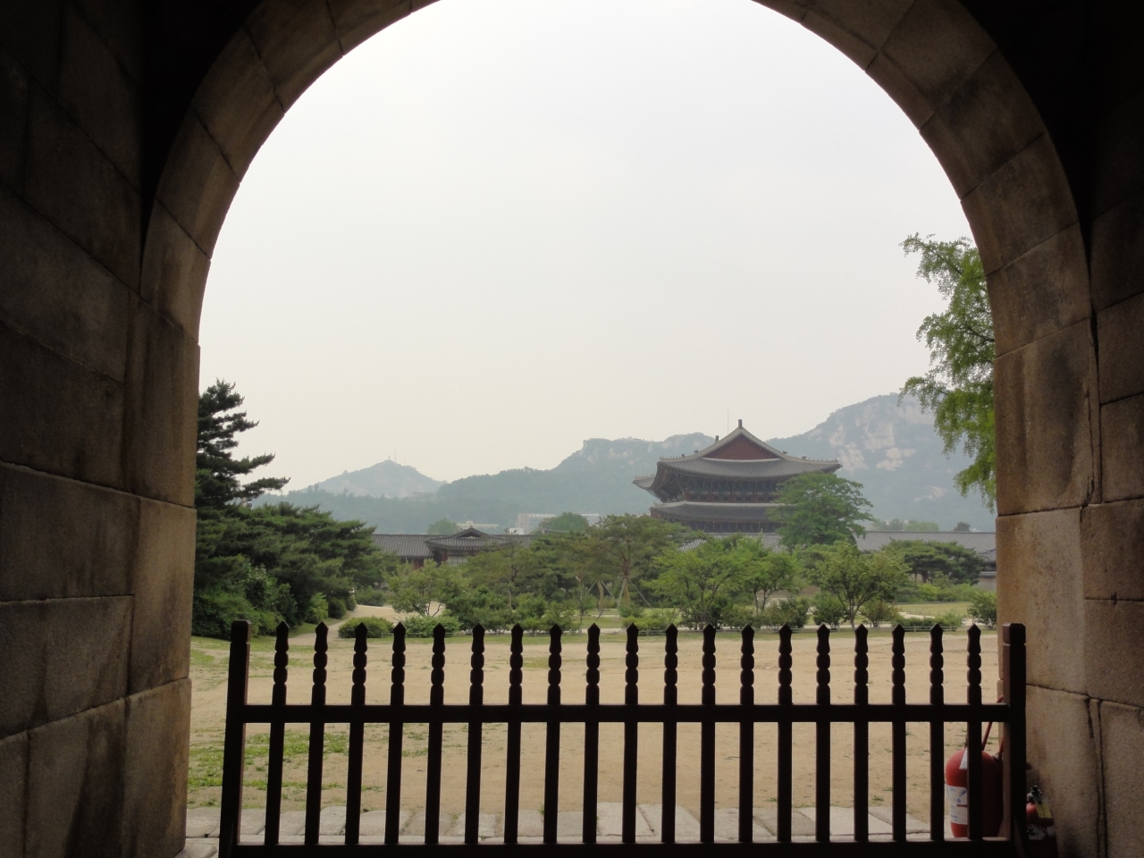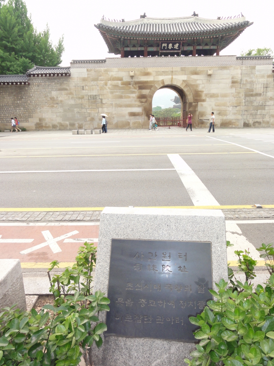 李朝正宮・景福宮の東門、三清洞路・景福宮東側駐車場の北側に位置しています。正殿・勤政殿の屋根がみえます。この付近にはかつてあった官庁など建物跡の石碑が複数あるので、役人が景福宮を訪れる際に良く利用した門なのでしょう、おそらく。