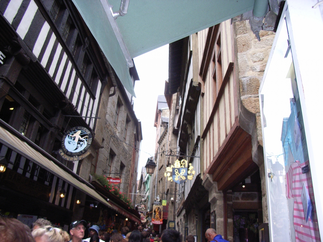 モンサンミシェルは人気の観光地なので、メインストリートはすごく人で混んでいました。看板がとてもかわいいのがフランスらしいですね。