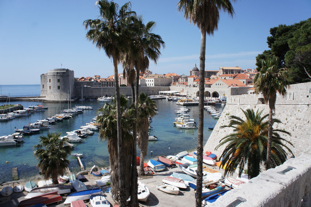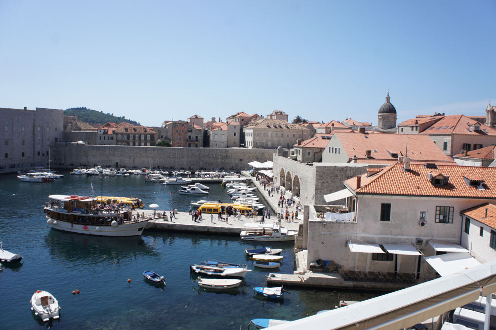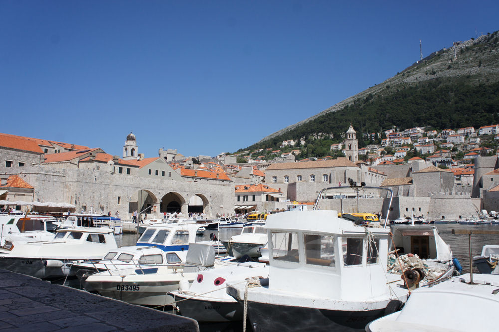 ドブロブニク旧市街の東側にある港。たくさんの船が停泊しています。