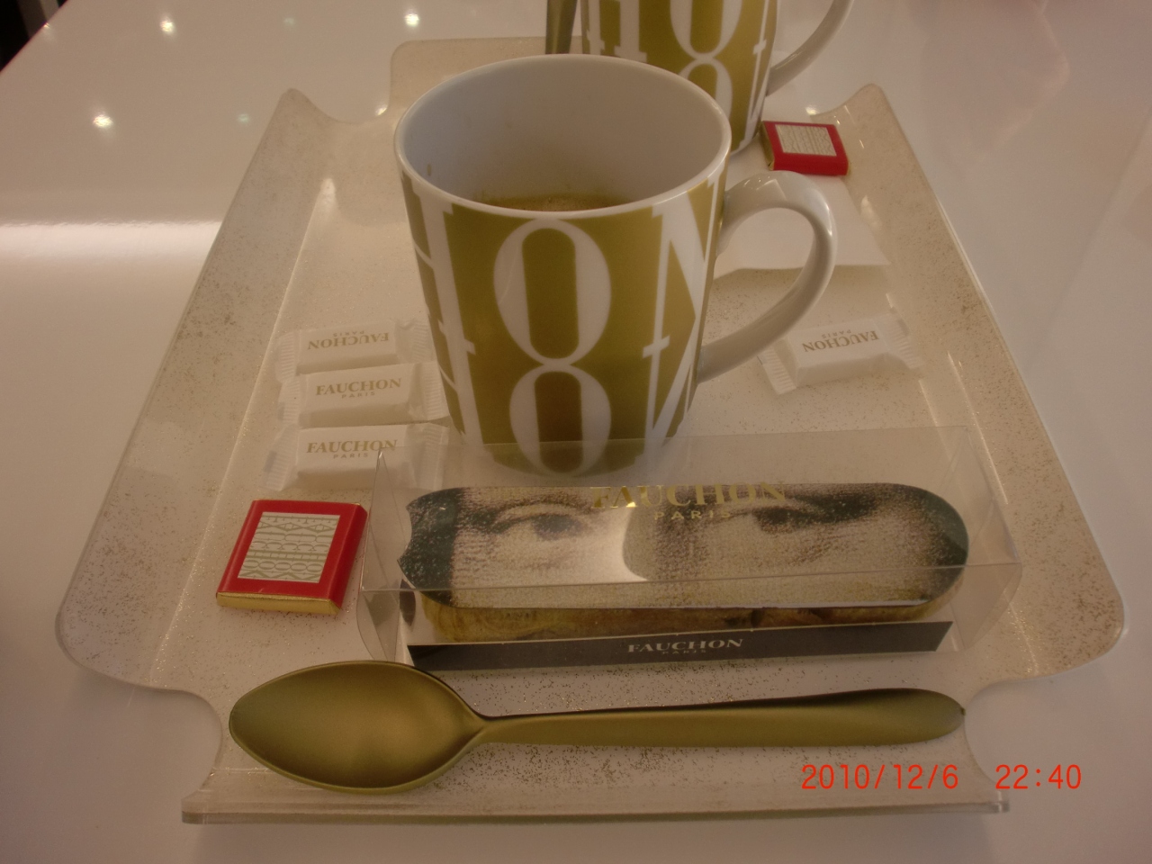 マドレーヌ広場付近で買い物し、もちろんフォションでもチョコや紅茶、ジャム等を購入し、あまりに疲れてしまったので、フォション2階のカフェでお茶しました。1階で注文と精算をし自分で2階まで持っていきます。ほぼ2階の席はいっぱいでした。めずらしいエクレアがあったので買ってみました。モナリザの顔がプリントされています。最近では日本でも見かけるようになりましたが、ほんとパリはおしゃれなものがいっぱいです。
