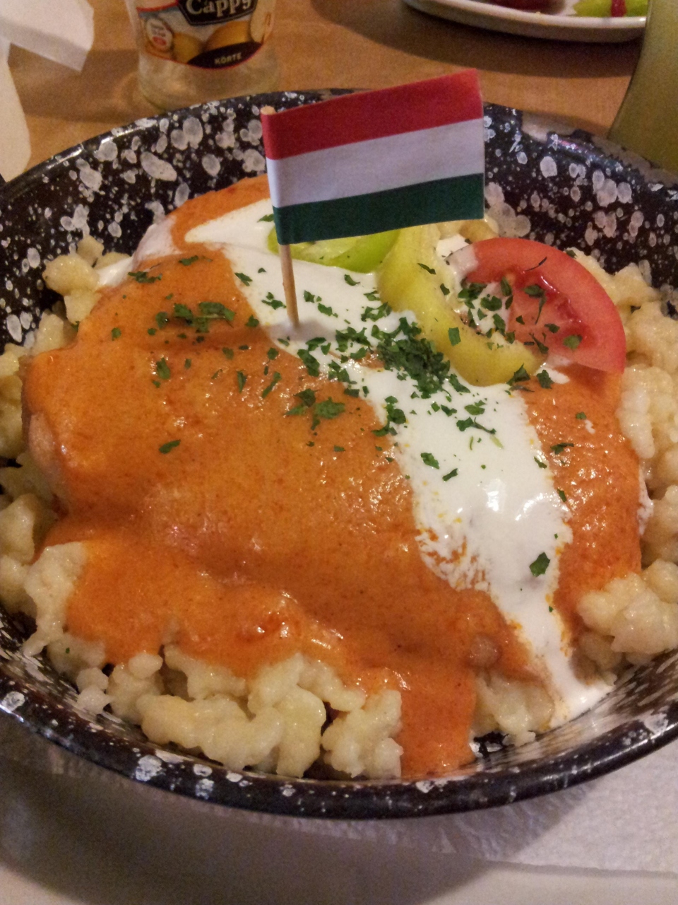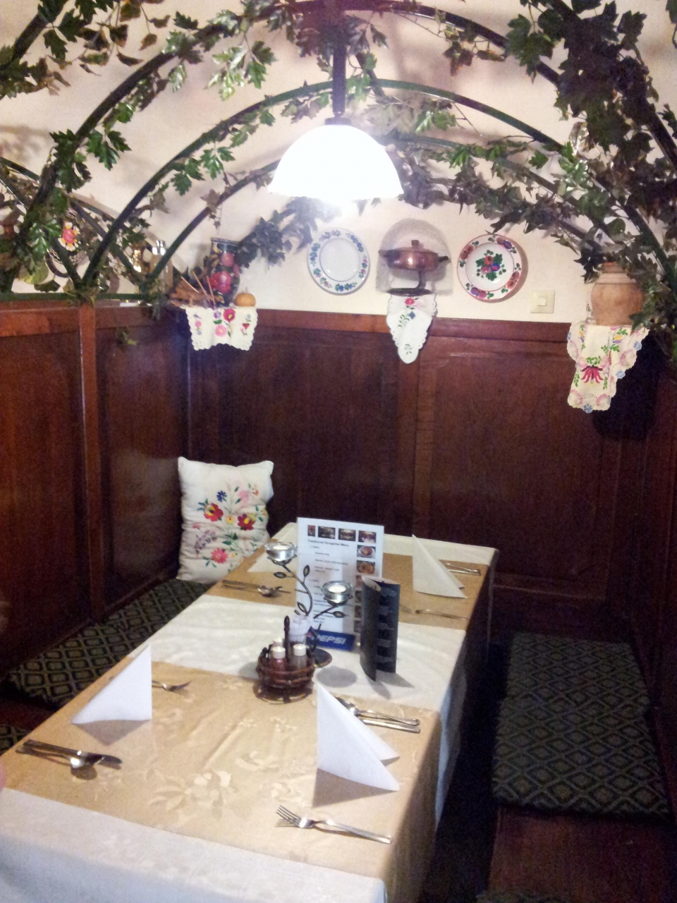 ハンガリーを初めて訪れた友人に、ハンガリー料理を紹介するべく選んだお店がココ。観光客用に、代表的ハンガリー料理が味わえるコースが2種類用意されていて、私たちは安い方を選んだ。なぜなら最初のスープがグヤーシュだったので。高い方、といっても大きな違いはパーリンカが付いてくるか否か。ハンガリーに住んではいるが、パーリンカは何度飲んでも美味しいとは思えない。メインはパプリカチキン、デザートはパラチンタ(ハンガリー版クレープ)だった。地元の昔からのレストラン、という雰囲気でハンガリーを味わうにはぴったりだと思う。味はまぁまぁ。ディナー時ということもあり、ピアノで演奏しながら歌ってくれる笑顔の素敵なおじさんが印象的だった。
