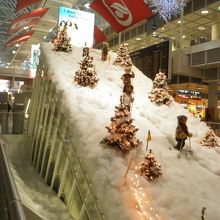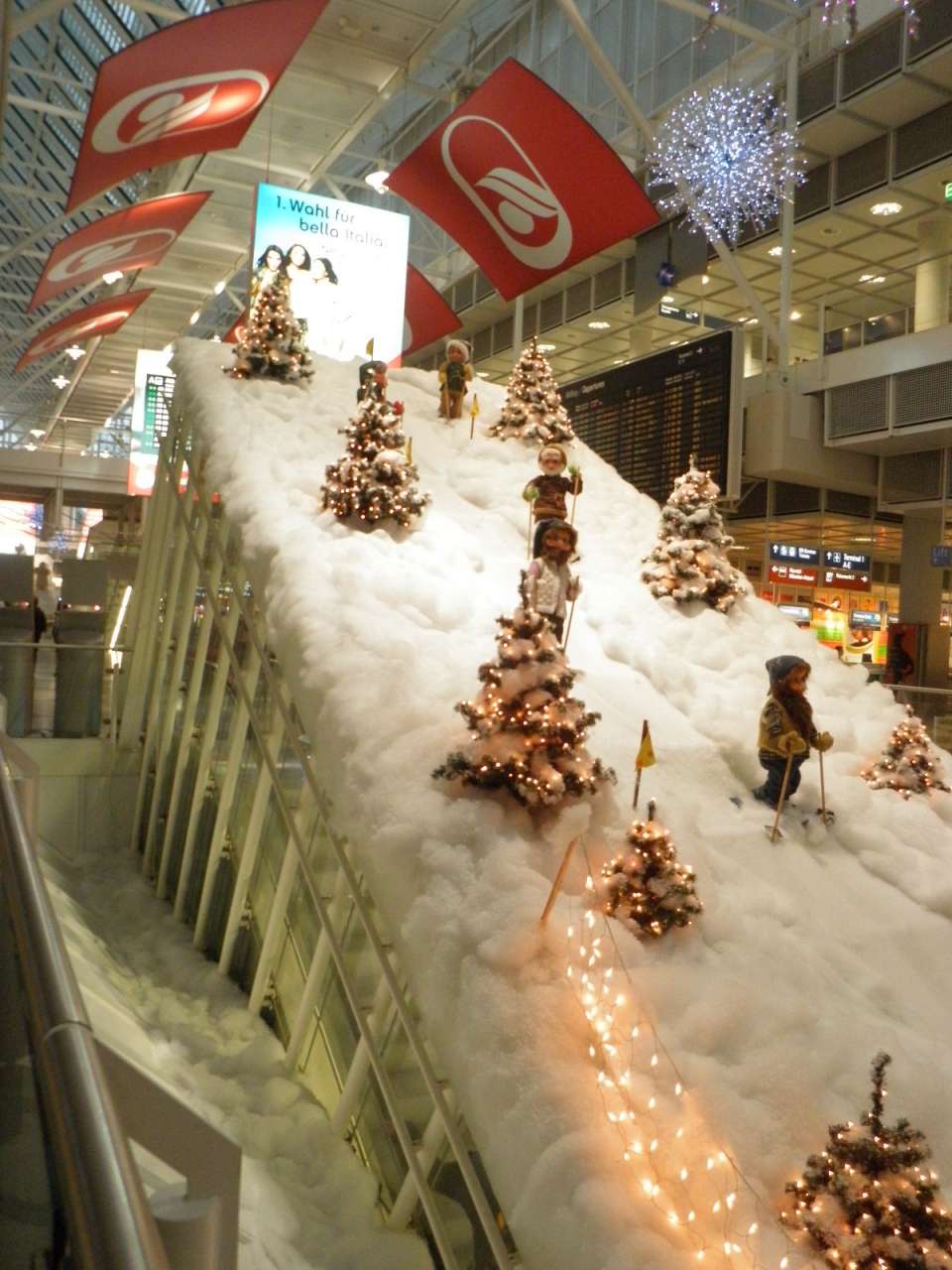 ミュンヘン市内からルフトハンザのバスで40分ほどでしたが、2014年にはリニアモーターカーで結ばれわずか10分ほどになるとか、もっと便利になりますね。空港は広いですが一直線の作りなので分かりやすいです。エスカレーター上に、可愛いスキーヤーの人形がレイアウトされてました。冬バージョンなのかな?