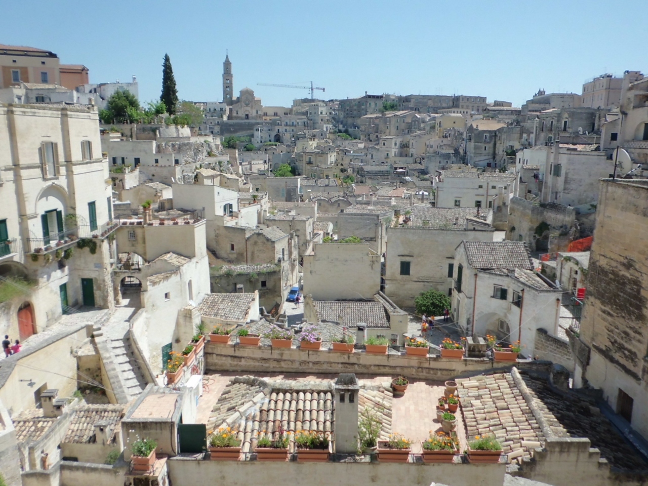 広場の東側には、17世紀のマテル・ドミニ教会の右側に三連アーチが並び、そのテラスからは、ちょうど真正面に大聖堂を捕らえたサッシ地区のパノラマが見えます。足下には、サント・スピリト教会とサッソ・バリサーノ地区への抜け道があります。