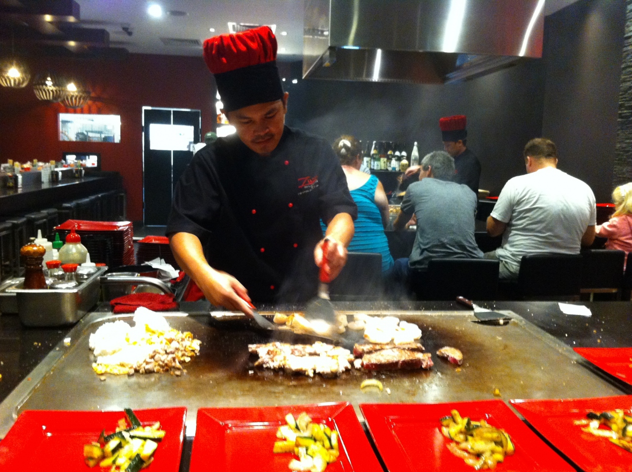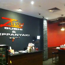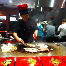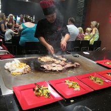 いわゆるパフォーマンスの鉄板焼と回転寿司のお店です。