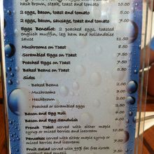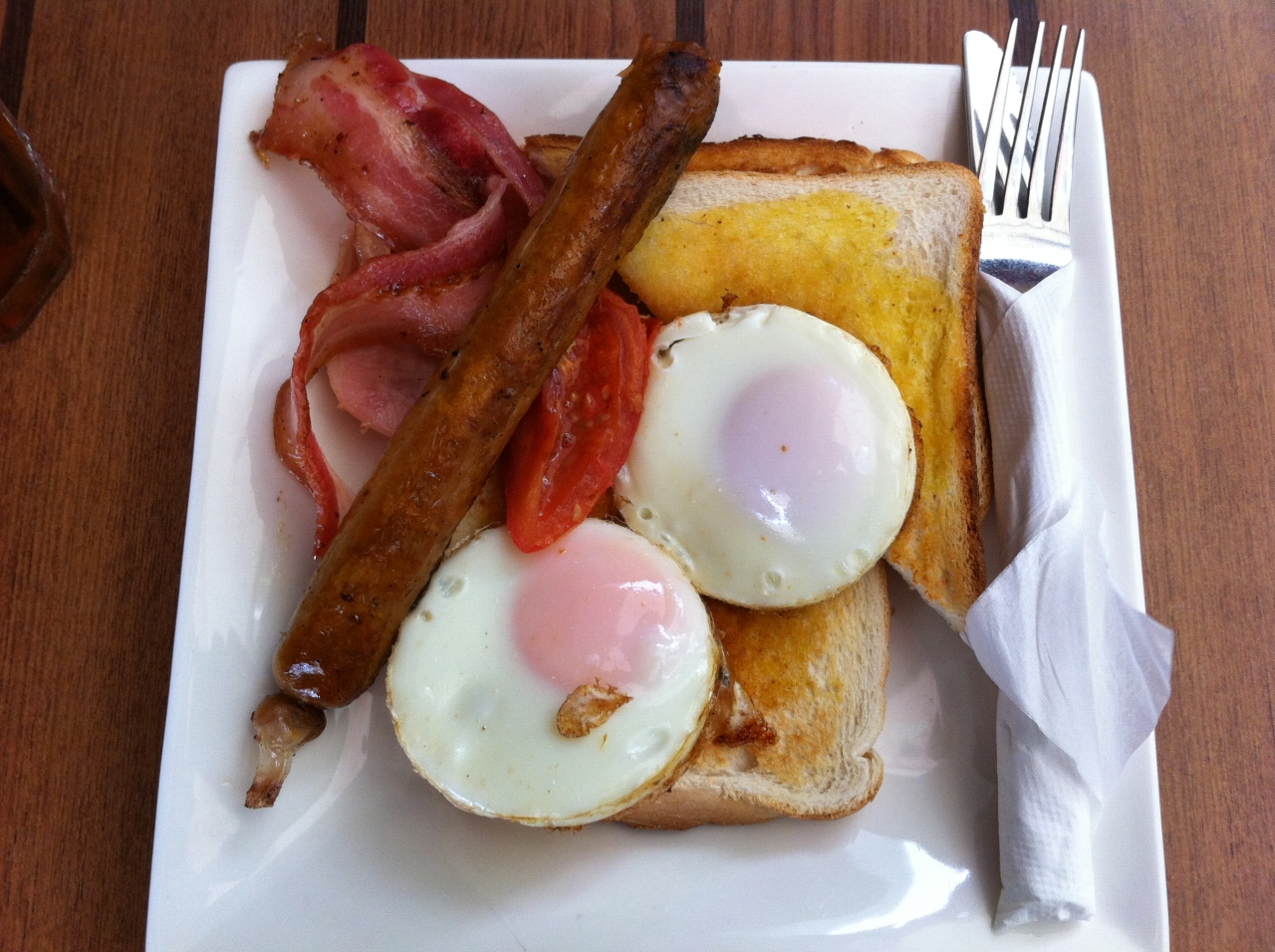 (2個の目玉焼きとベーコン・ソーセージ・トーストと焼トマト)を頂きました。