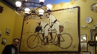 ピカソが通いつめたといわれる有名カフェです。地図を見るとカタルーニャ音楽堂の近くにあったので、音楽堂のツアーが始まるのを待っている間に、開店前のお店をのぞきに行きました。有名なカフェなのでもっとにぎやかな通りにあるのかと思っていたのですが、思いっきり路地裏なので一瞬場所を間違えたかと思いました。結構大きなお店で、有名な二人乗り自転車の絵が飾られている部屋のほかに左右に部屋があり、また、右の部屋には中二階もあるので結構な人数が入れるカフェです。