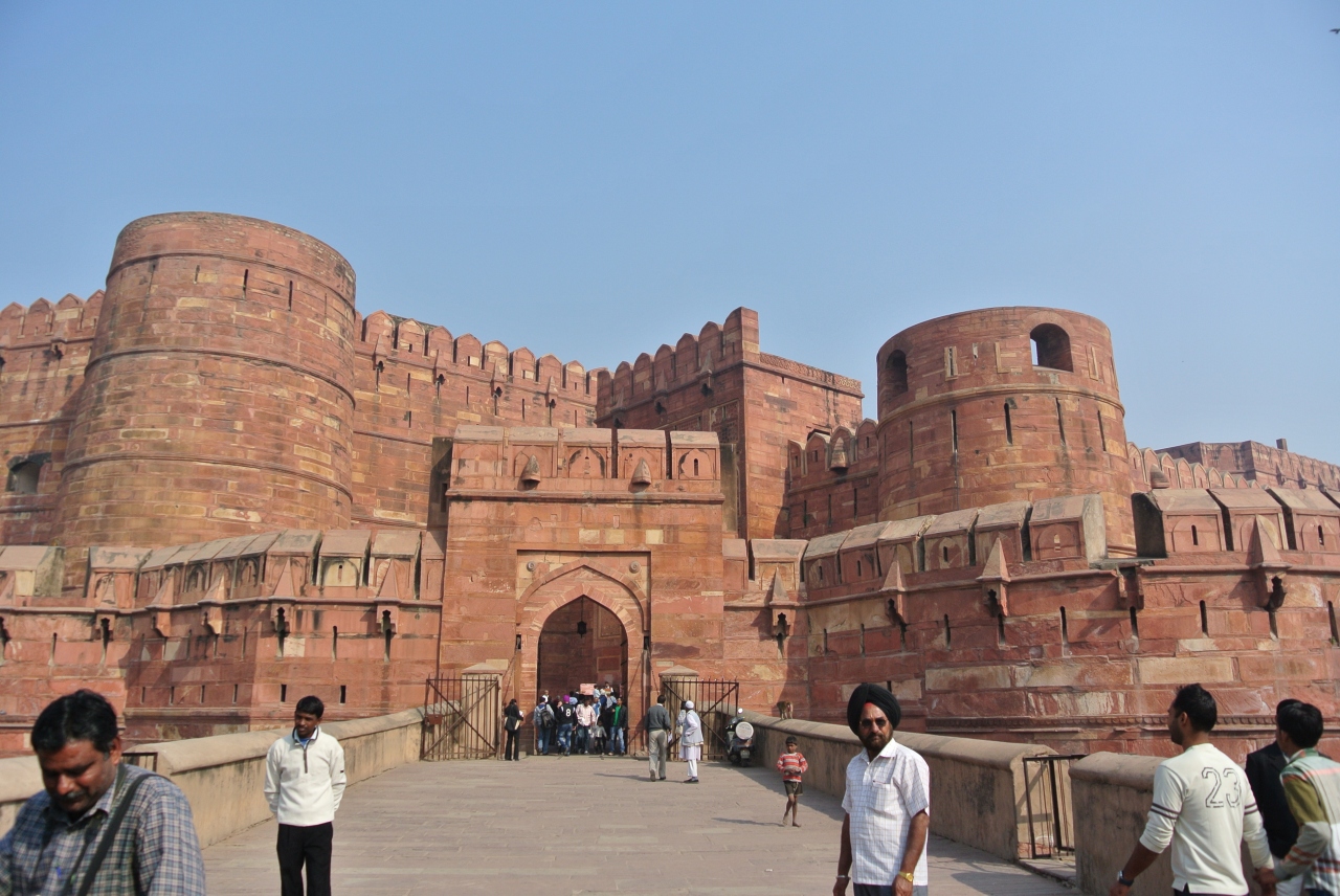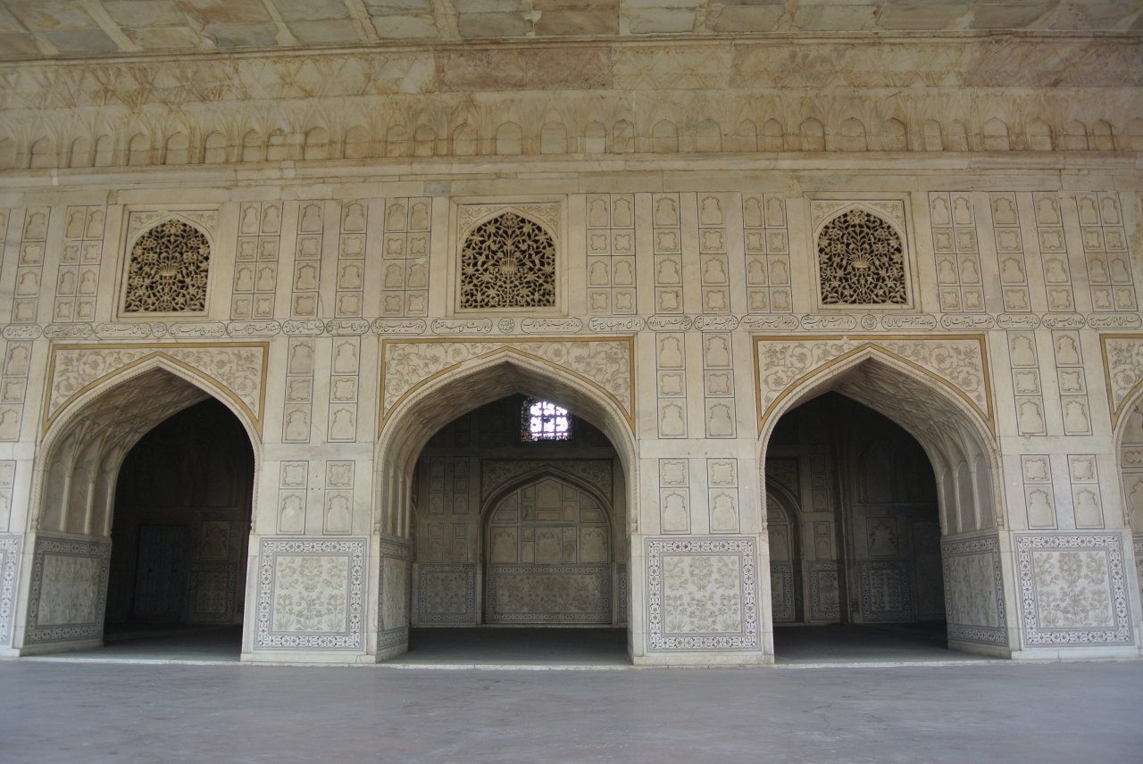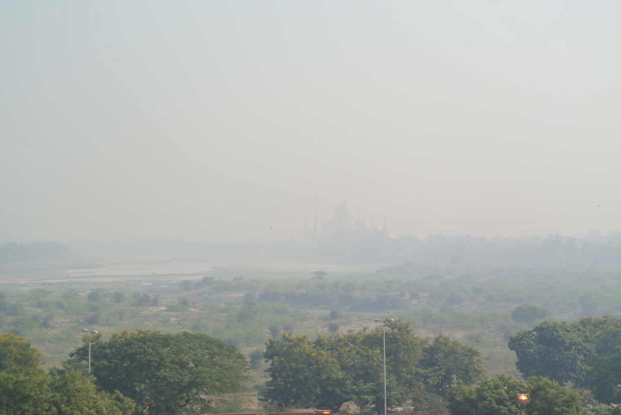 結構広いので歩き回ります。また要塞と名前がついていますが、お城と同じなので、内部には宮殿などの設備が有り、その部分は美しい彫刻で彩られています。この城から見るタージ・マハルは格別とのことと聞いていましたが、私が行った日は霞がかかっておりかすかに見えるといった感じでした。