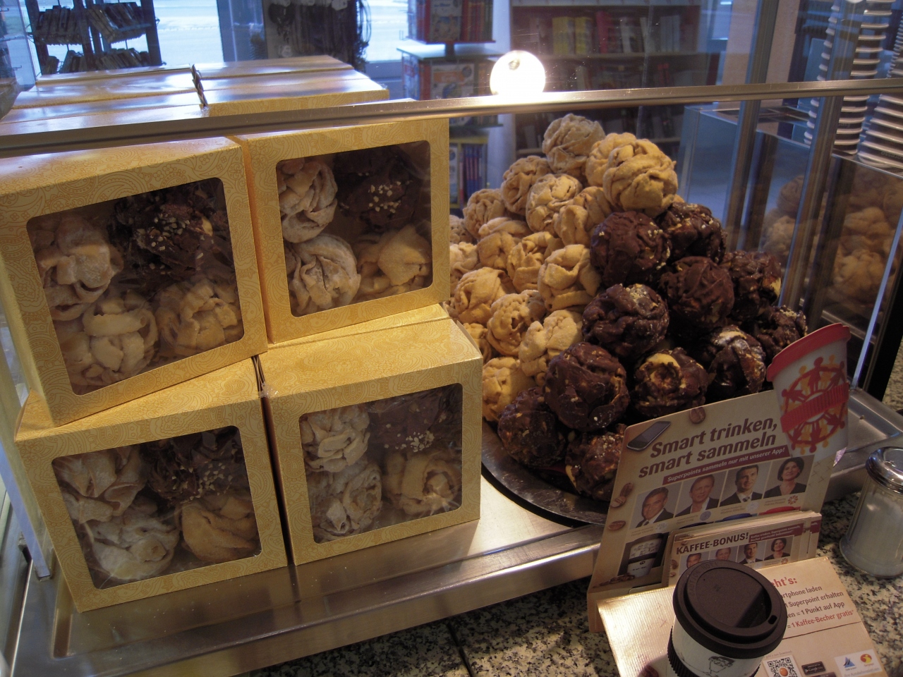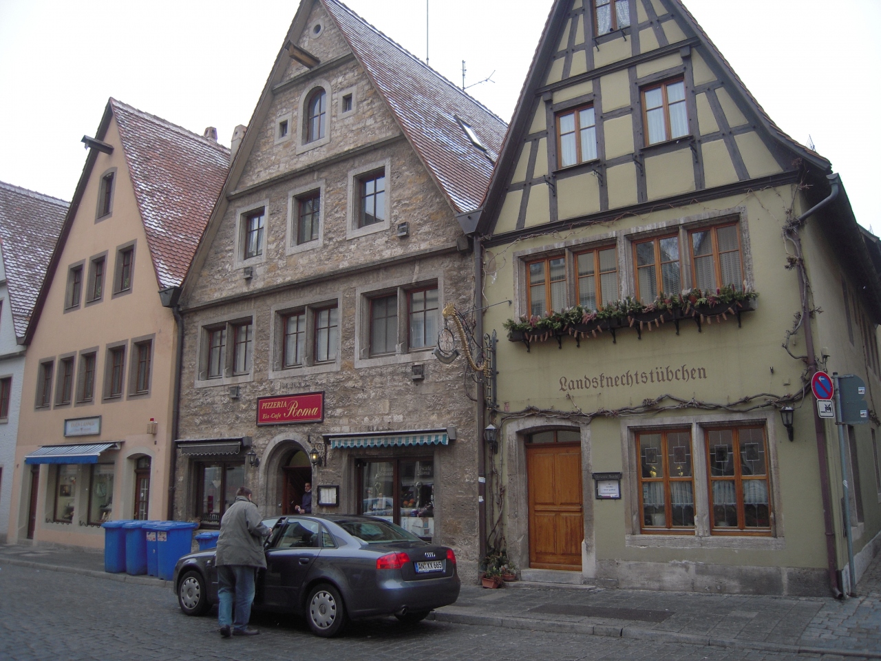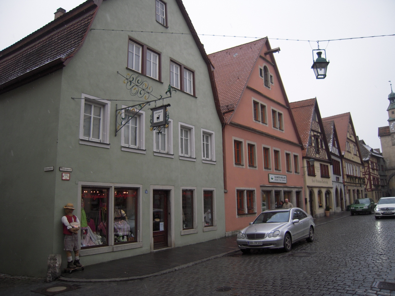 時計台のからくり人形を見、市庁舎の向い側の店を見、坂を下った城壁から、