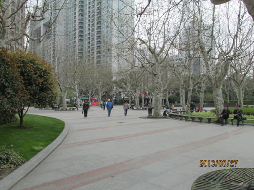 昨年葉桜になったので今年は早目に上海へ来たが日本と同様に更に開花が早まりました。上海で南京東路と並ぶ繁華街淮海中路に面した小さな公園です。裏側は新天地の第2期工事中のビルと隣接し、景色が変わって来ています。早咲きの桜が1本ありますが既に葉桜
