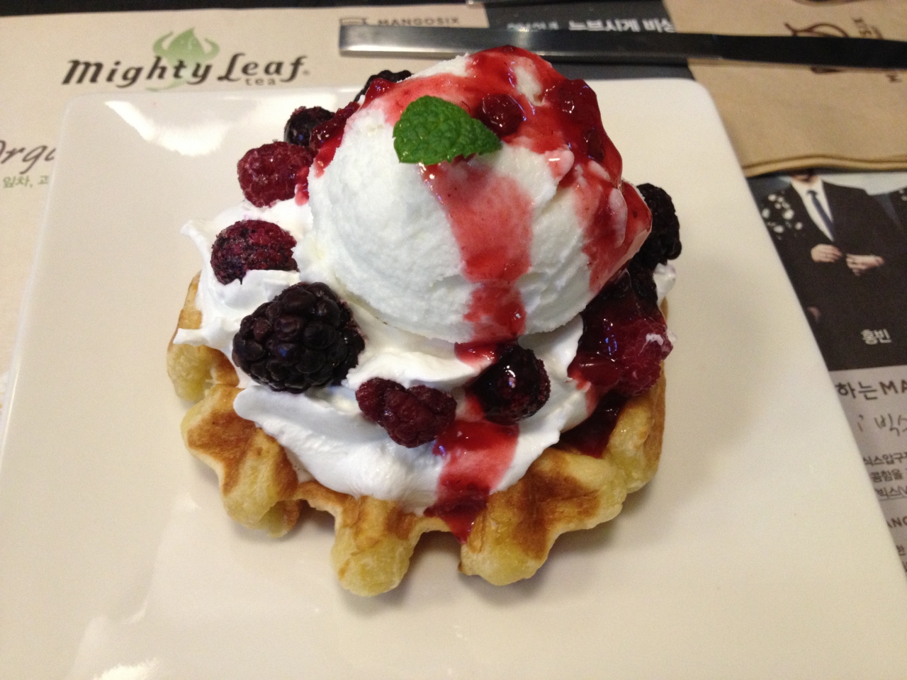 ミックスベリーのワッフルも頼みましたが、フランボワーズが冷凍のままで固く、味もせず、ワッフル生地は粉っぽさが残っていて、とても美味しいとは思えません。