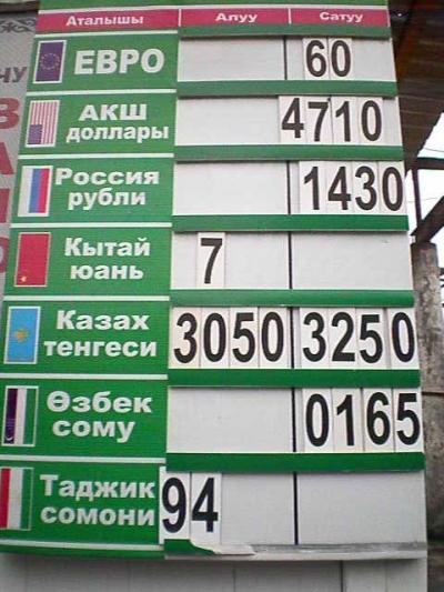 このレート表を見ればどの通貨が強いのかが良く分かる。米ドル、ユーロ、ロシア・ルーブル、中国元、それからカザフ・テンゲ、等々だ。