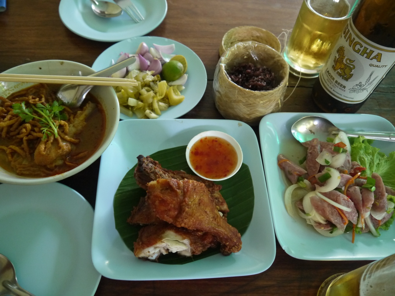 2人でランチに訪れ、カオソーイやチェンマイソーセージのサラダ、揚げ鶏、もち米、ビール、を頼みました。