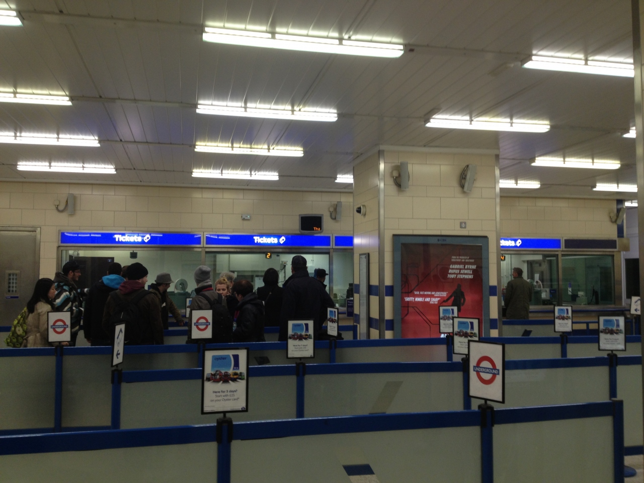 私の場合ターミナル3に着いたのですが、[Underground]の表記は至る所にあるので、それをたどると着きます。だいたい7、8分歩くと改札にでるのでそこでオイスターカードの購入をお勧めします。