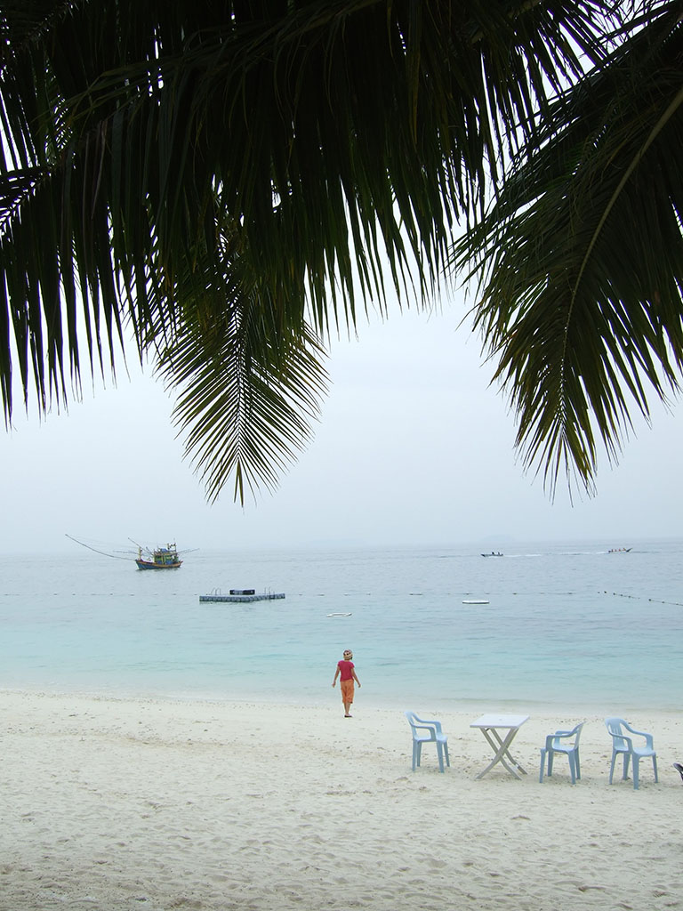 クチル島のロングビーチの方が白砂の長いビーチできれいだし、景色も良いですが、メインビーチの透明度もなかなかです。シャレーが所狭しと立ち並んでいるので、ちょっとごちゃごちゃした感じはありますが、食事するところには困りません。埠頭が2つあり、一つは本土からのフェリー用、もう一つは島間のボートタクシー用です。