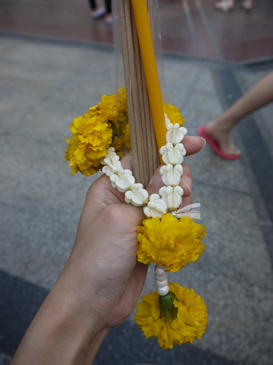 クチコミ通り、境内の売店でお詣りセット20バーツを購入。