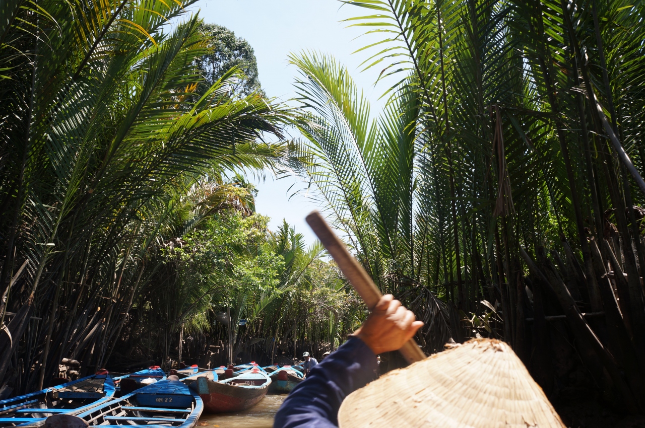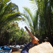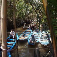 マングローブに挟まれた、幅5m程の川に沢山の手漕ぎボート。