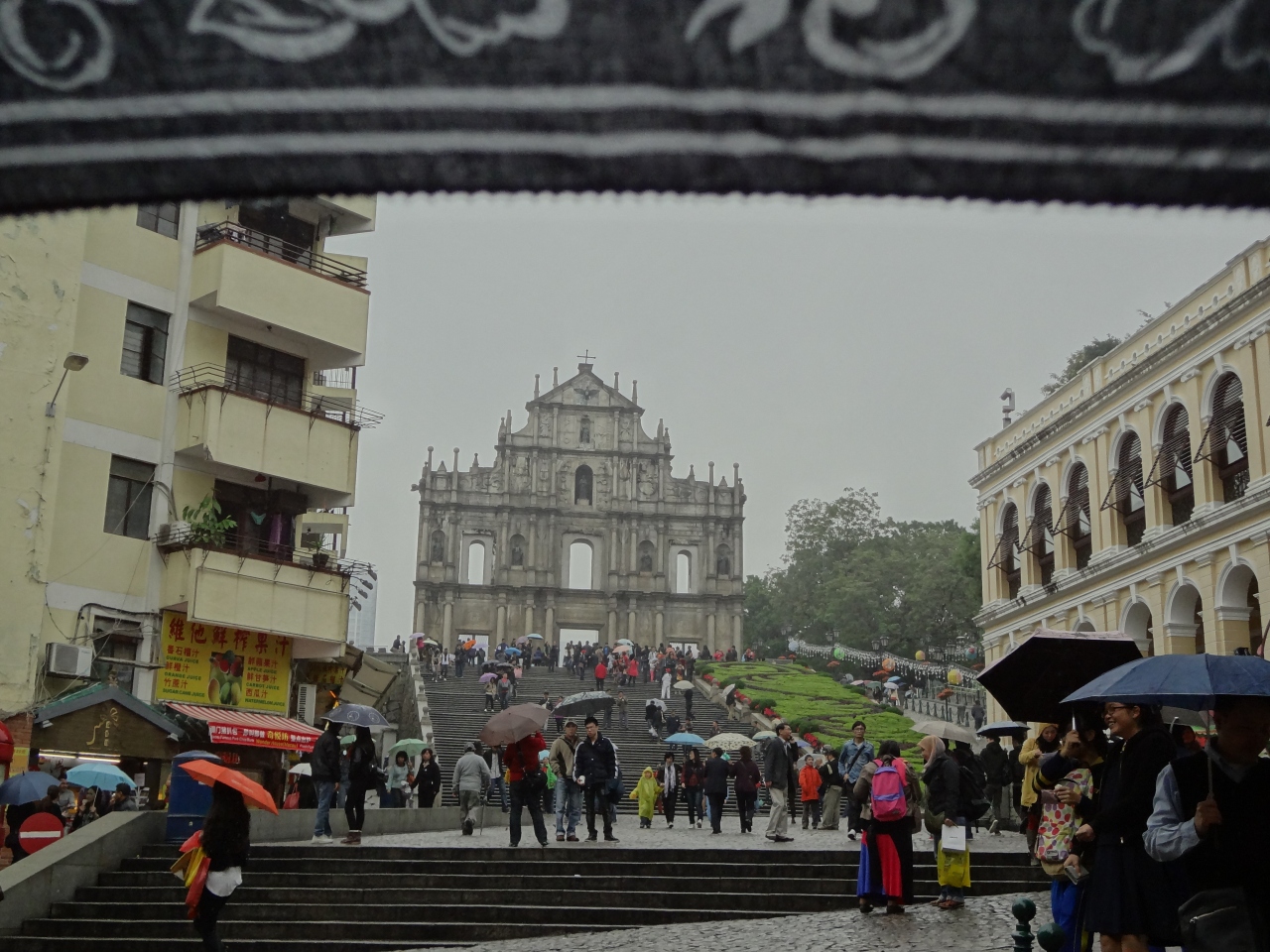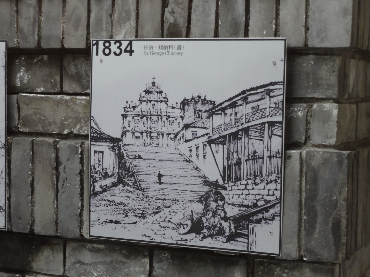 土産物店が並ぶ道を人の流れに沿って歩いて行くと、急に前が開けて聖ポール天主堂跡が見えます。