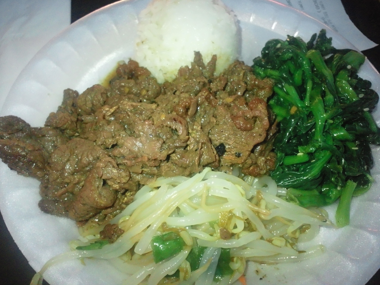 一人だったのでフードコートで済ませようと、以前から気になっていたので行ってみました。薄切り牛肉を炒めたものにほうれん草ともやしのナムルを付けました。味付けは日本人にも馴染のある甘辛です(甘みが強め)。調味料目分量で適当に作れそうな感じで、特別に美味しい訳でもありませんがご飯が進みます。