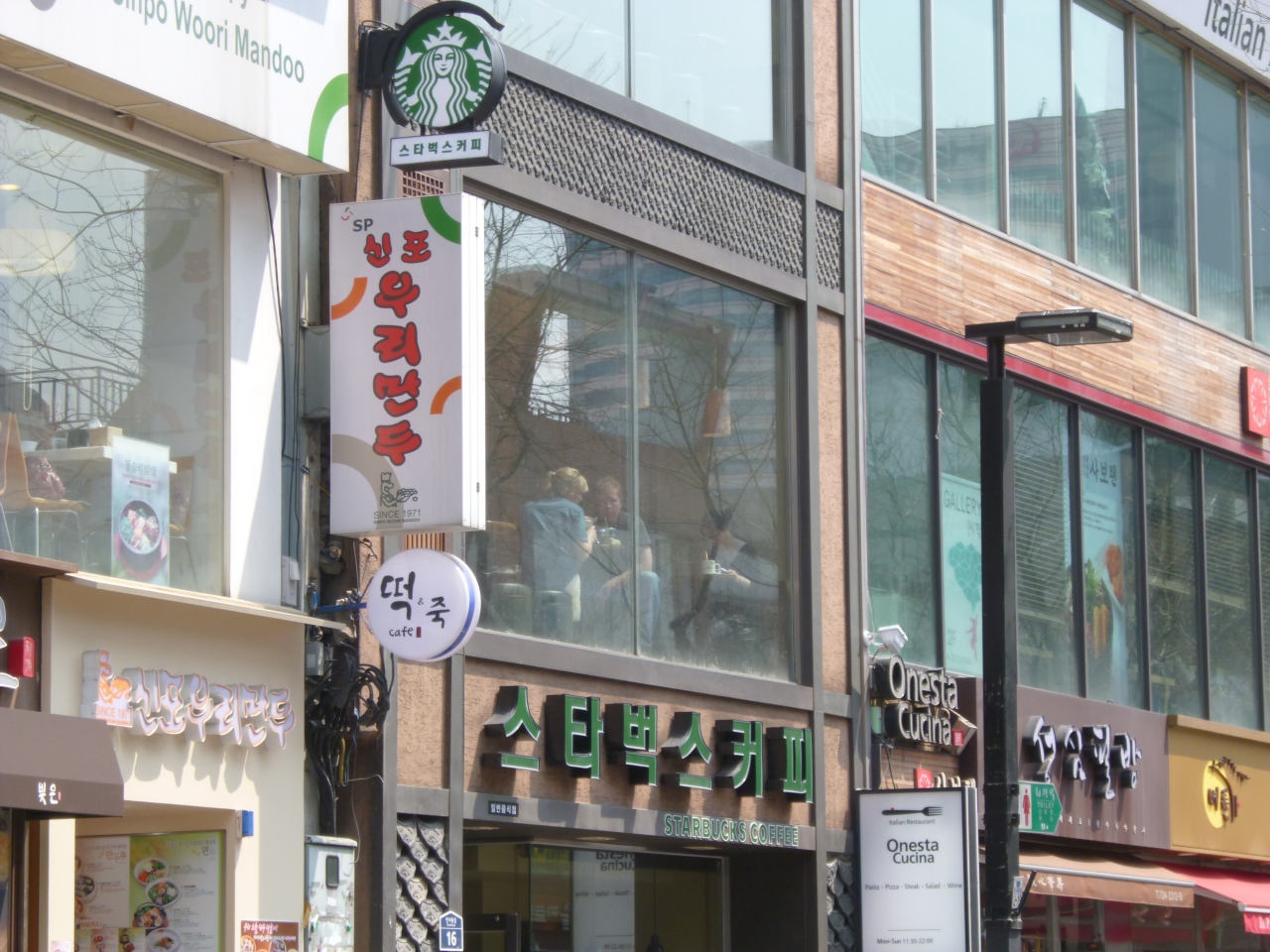 世界中でただ1件だけ、ここのスタバは文字がハングルでアルファベット表記でないのです。スタバは全世界統一でアルファベットなのですが、こちらの仁寺洞のエリアは歴史ある街並みを観光資源と指定していて、スタバもハングル語表記になっています。それ以外は普通のスタバですが、外観がちょっと他と違います。