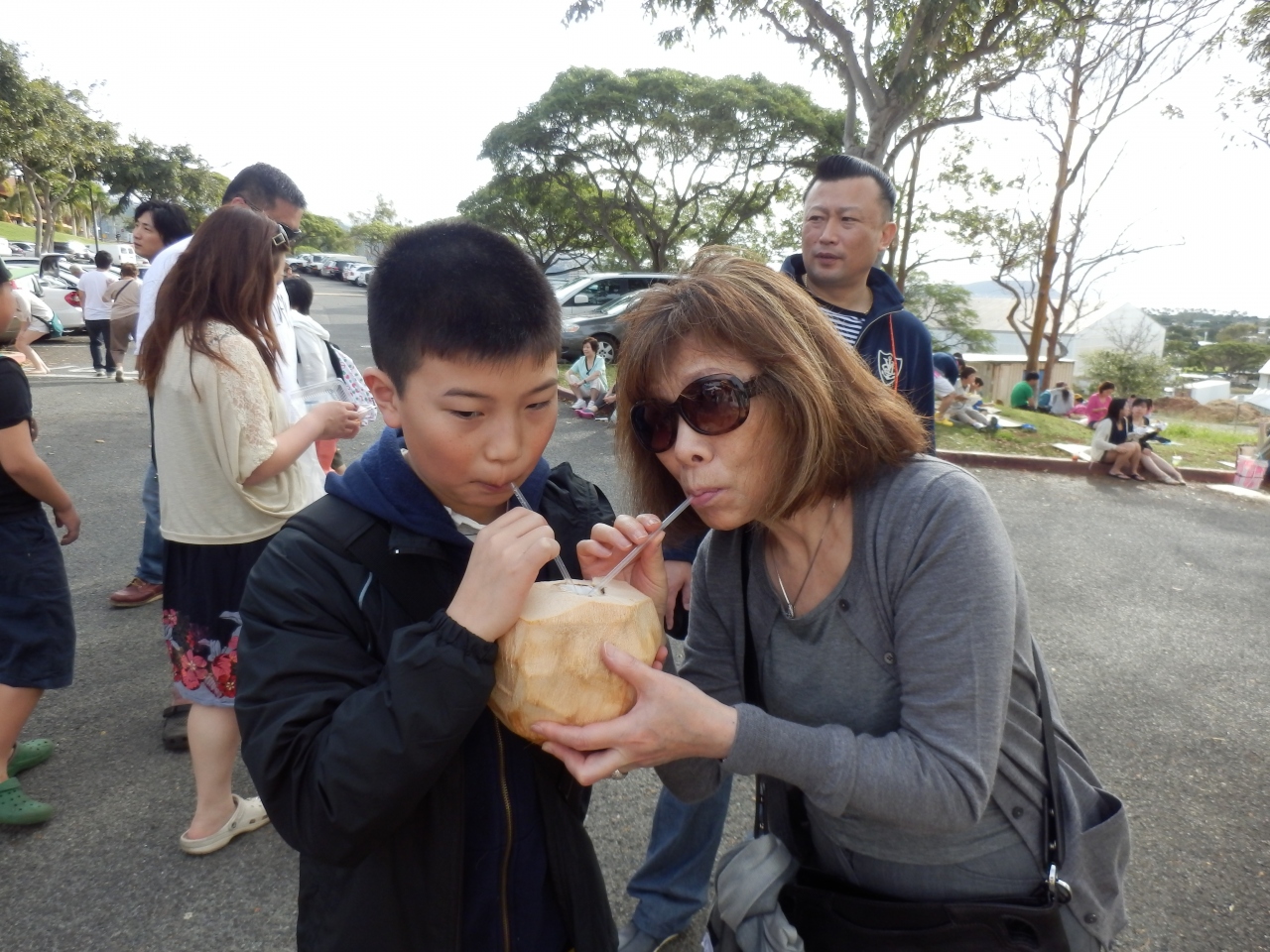 ダイヤモンドヘッドから下山してまっすぐ歩いて行きました。朝ごはんを軽くすませる感じで。アワビのコーナーは行列で断念!座る場所も無くて(混んでいて)立って食べました。そこでしか買えないコナコーヒーを飲みながら回って楽し方です。ココナッツもその場で割って飲ませてくれます。味はともかく南国気分を味わえるかもwダイアモンドヘッドのコースへ組み込むといいですね。