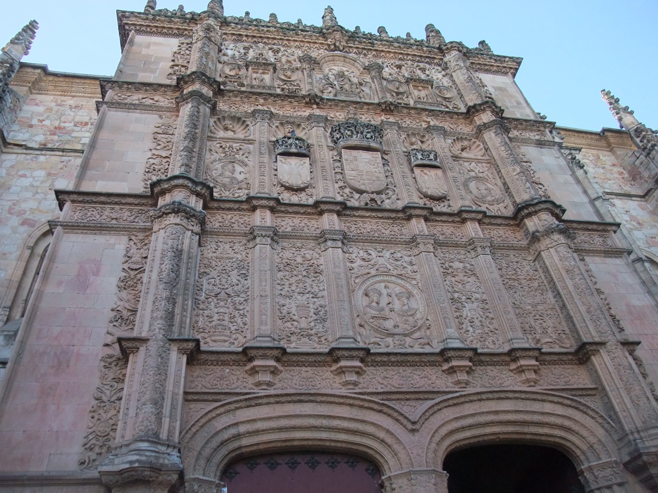 サラマンカは大学都市として発展してきて、世界中から留学生が集まる街。今でも人口の中で学生数の占める割合が高い。朝早かったせいかあまり学生らしい姿は見かけなかった。正面入り口の扉の彫刻がすばらしい。幸運を呼ぶというカエルを懸命に探した。そういえばサラマンカではカエルの人形をたくさん見かけました。
