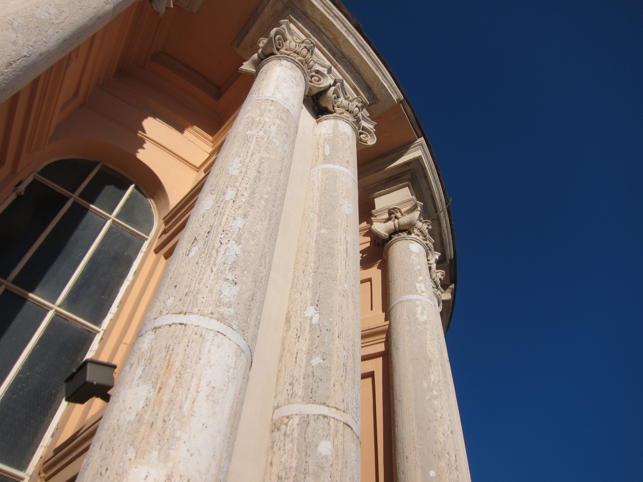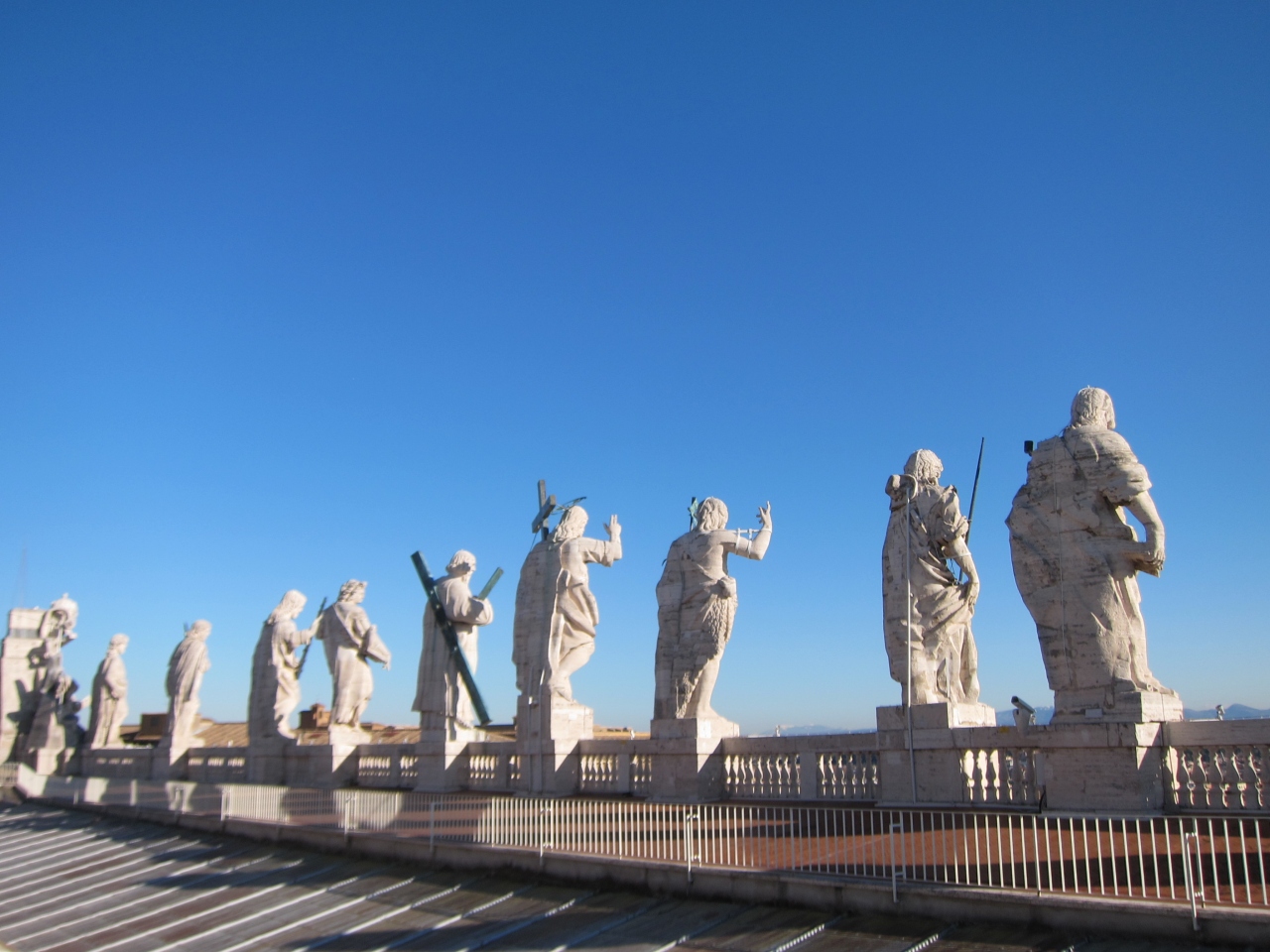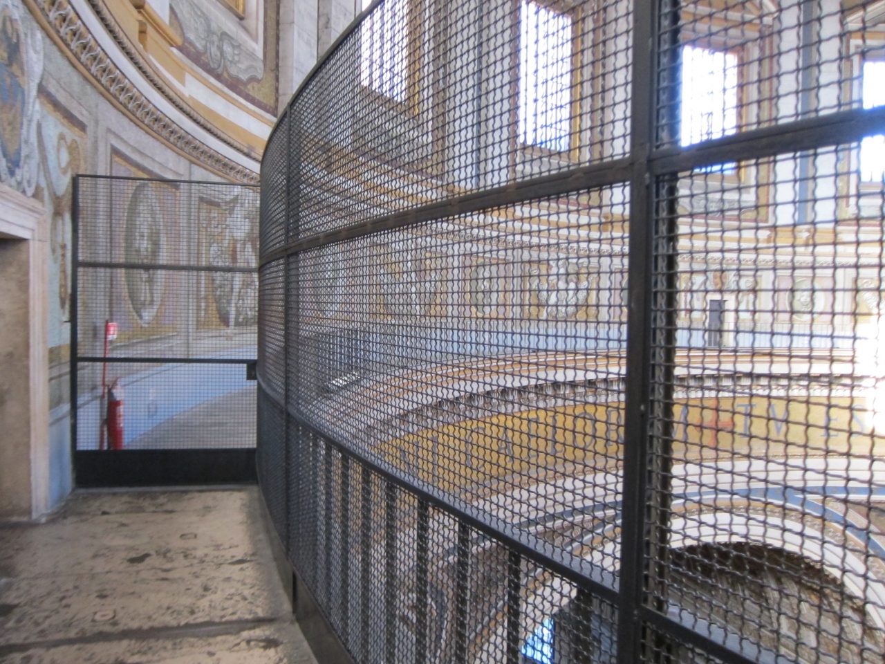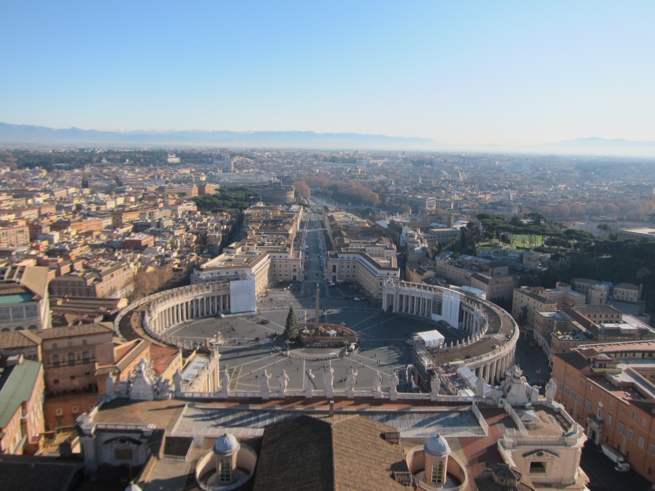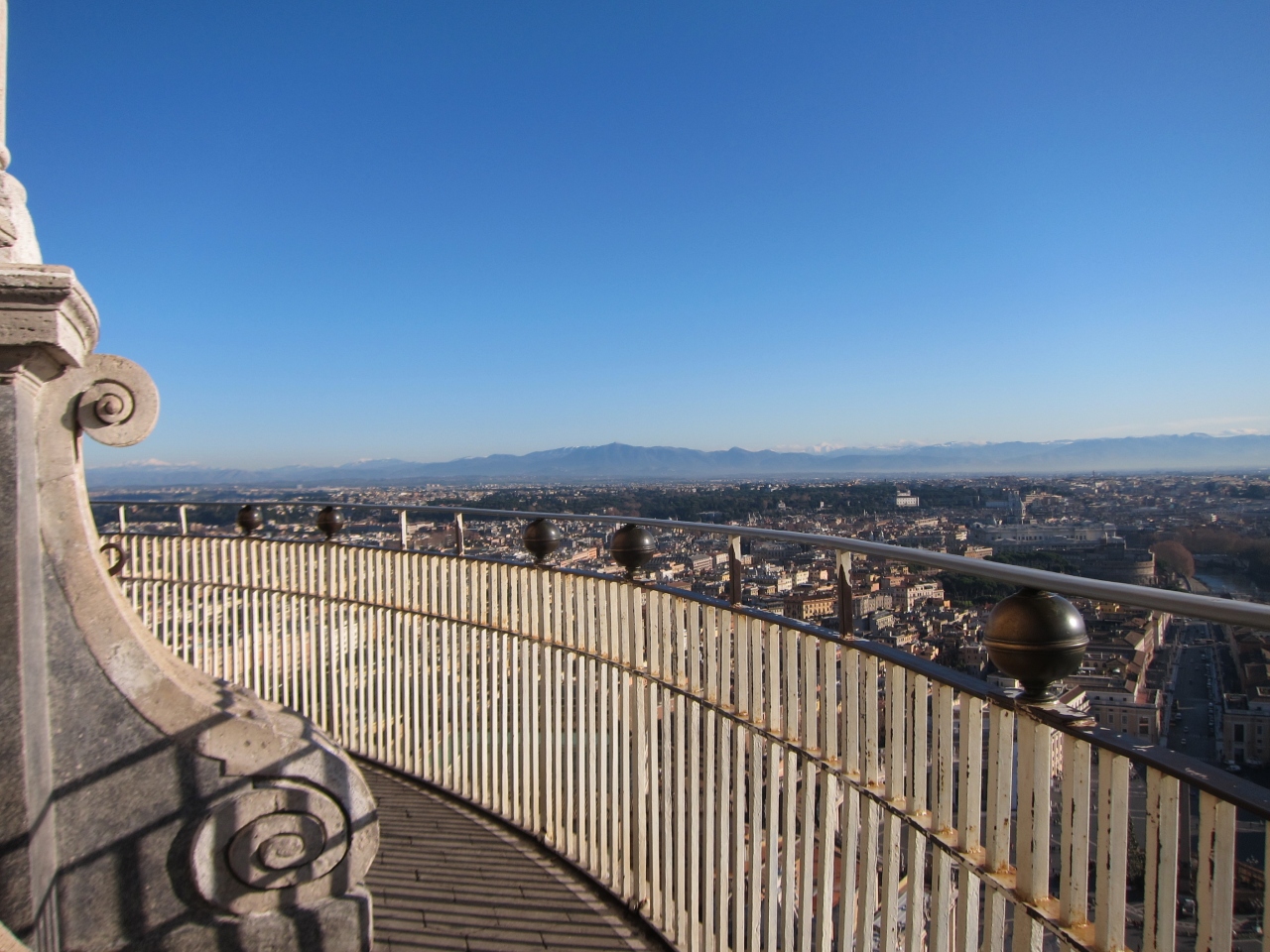 大聖堂の右側の共通の入口から手荷物検査を受けて入り、チケットを購入してエレベーターで上がります。一旦、大聖堂の屋上に出ます。おみやげ屋の店舗があります。更にドーム型のクーポラに入り、長くて人がすれ違うのがやっとな狭い階段を登る(330段)とクーポラの上に着きます。そこからはローマの街を中心から見渡すことのできる絶景が待っています。
