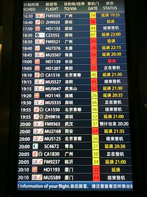 先週(4/19)に虹橋空港発のフライトを利用したのですが、私のフライトは1時間以上の遅れ、帰りの虹橋空港行きのフライト(4/20)に至っては2時間ほどの遅れでした。時々天候の具合によってはキャンセルもありえますので、キャンセルになるよりはましだと最近思うようになってきているくらいです。実際、同じゲートで待っていた別のフライトがキャンセルになり、現場は大混乱していました。