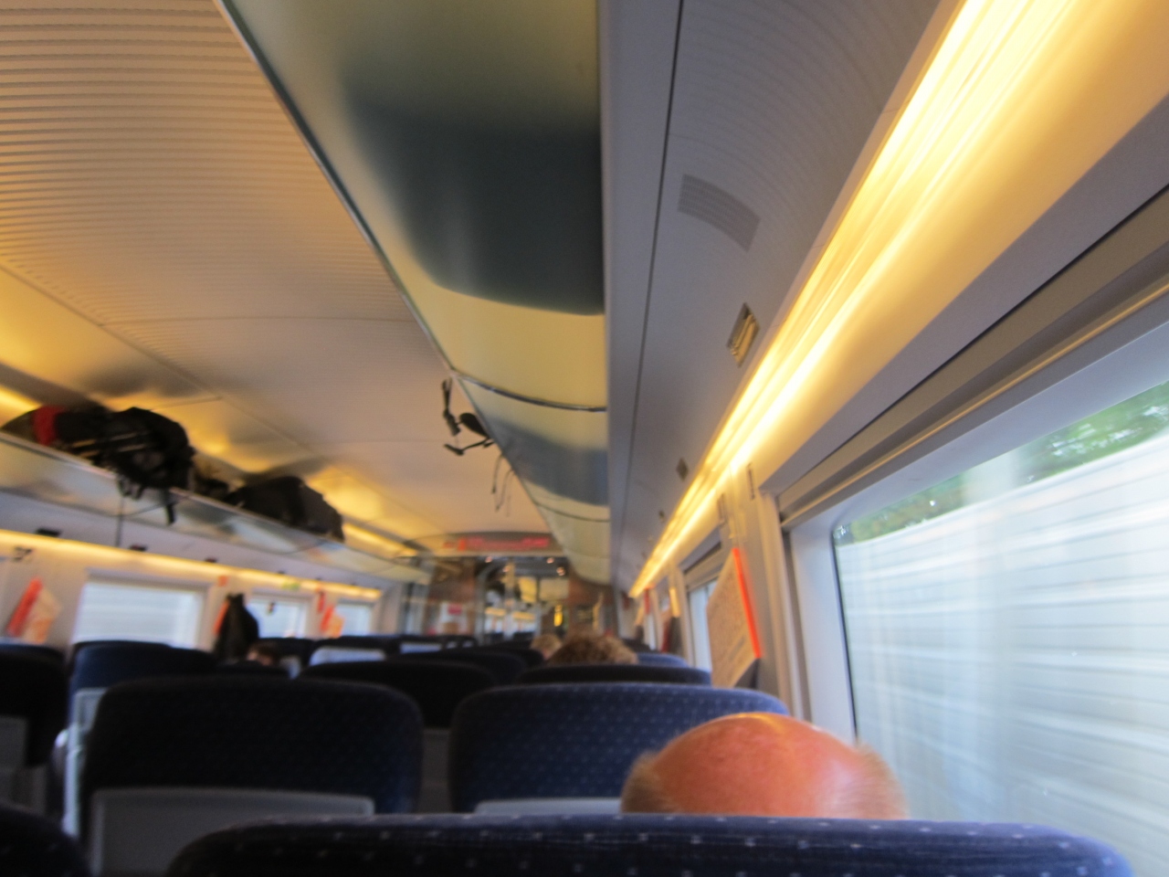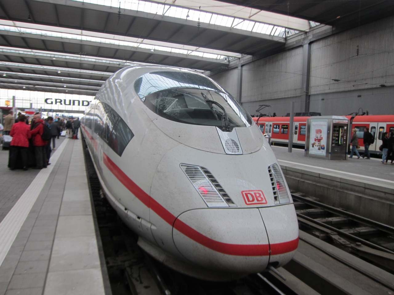 ミュンヘンからフランクフルト国際空港まで利用しました。所要時間は約3時間半。切符はミュンヘン中央駅の自動券売機で買いました。画面表示を英語に切り替えて操作していきます。残念ながら日本語はありません。行き先までの列車が時刻ごとに表示されています。ICEのものを選択した場合、席を指定するか聞いてきます。指定すると何ユーロか高くなります。このときは指定しなかったので、列車に乗ったら席の上のデジタル表示で利用者の予約区間の表示されていない席を探して座りました。2人がけシートが左右に並んでいて、席の間にはコンセントがあります。高速で走っていますが、モバイル端末も繋がり、ネット閲覧もスムーズです。途中検札が回ってきます。ときどき車窓を眺めながらあっという間に時間が過ぎてしまいました。