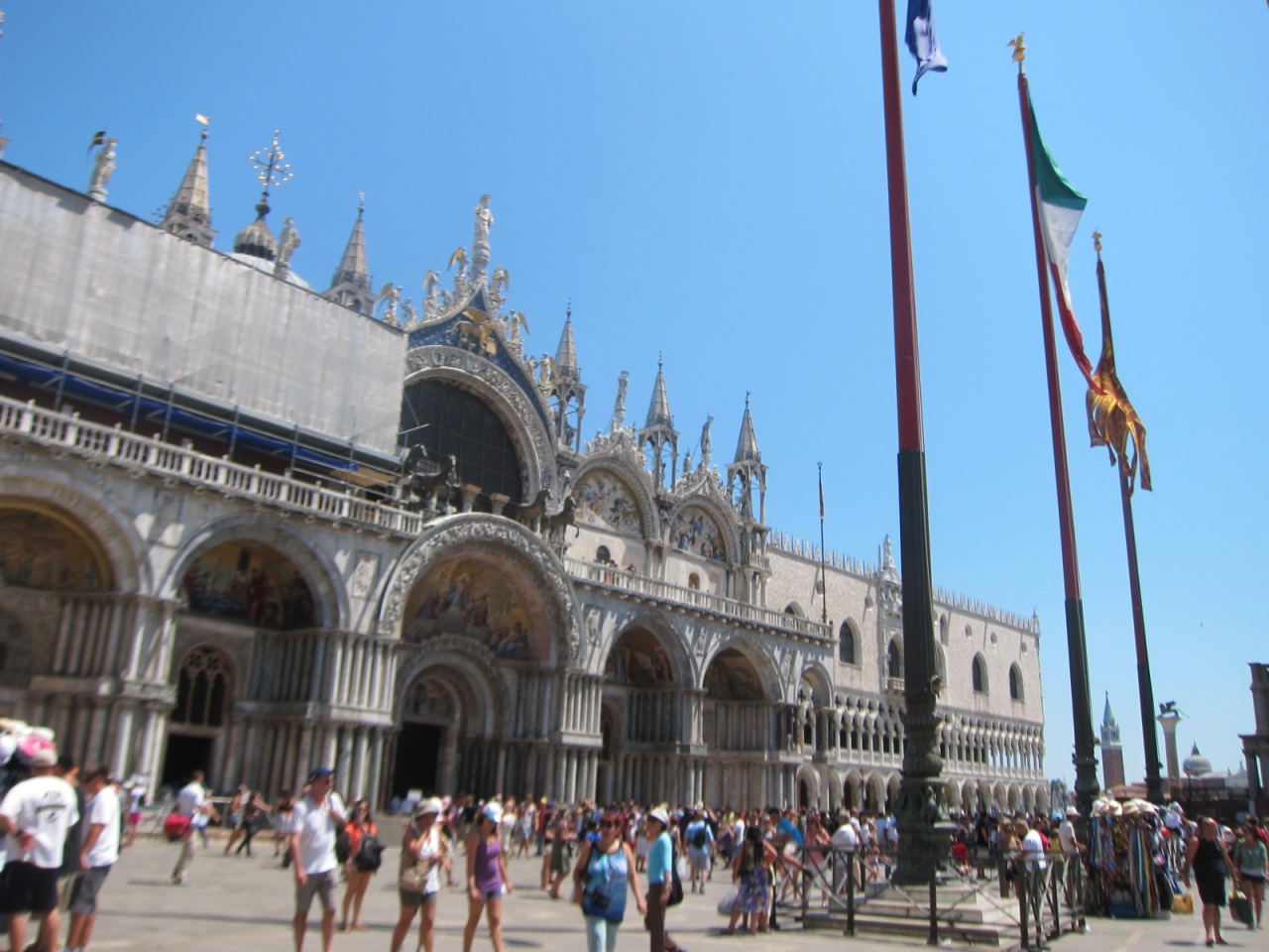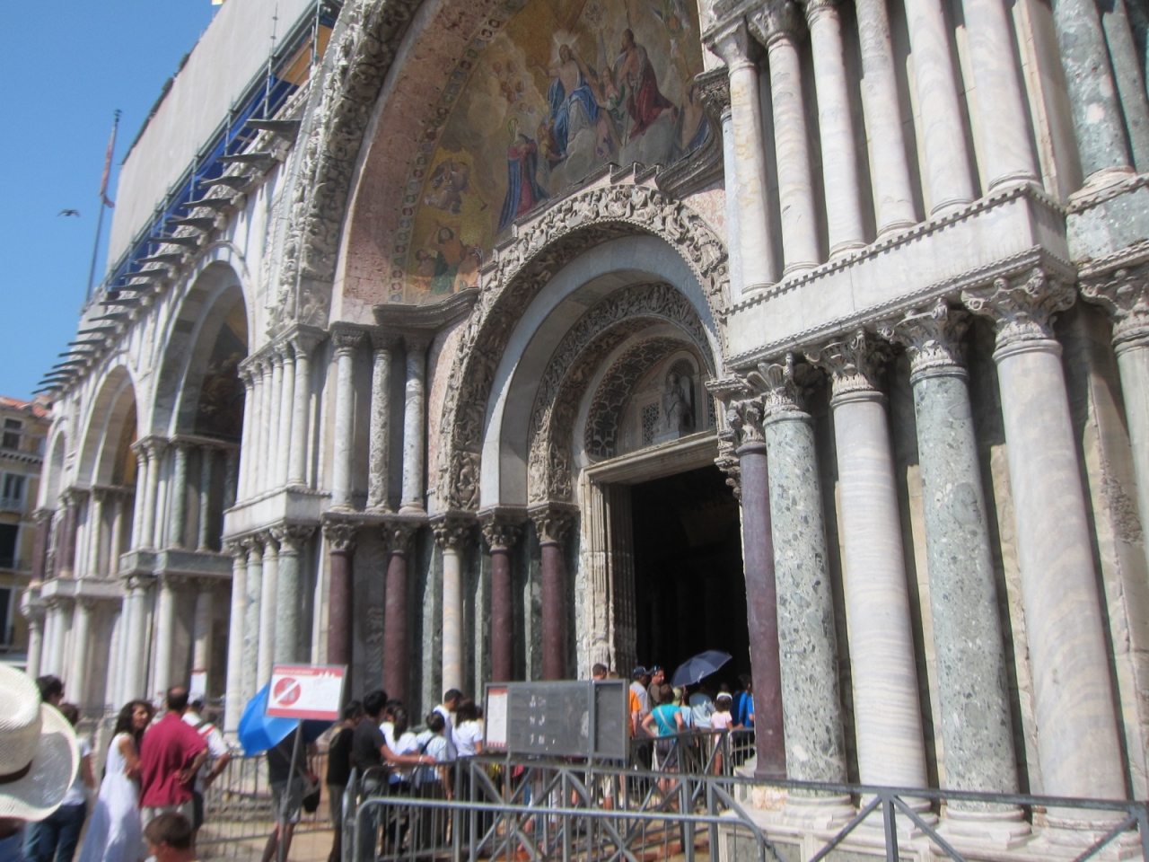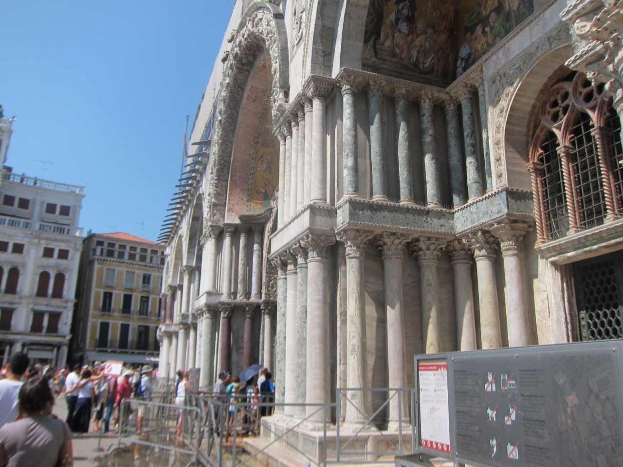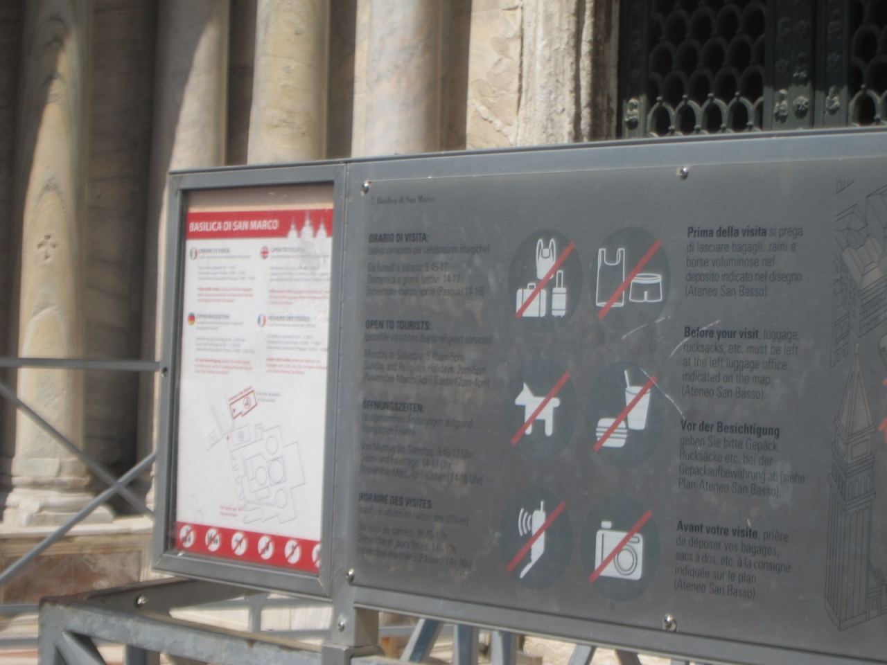 かなりの行列で人混みでしたが、中はやや暗い上に大したことありせんでした。隣のドゥカーレ宮殿の前哨戦として行きましょう。入場には大きな荷物を預けたり(デイバック不可)、肌の露出や派手な服装には巻き布を貸し出されたりと少し面倒くさいのですが、逆に荷物を預けられて身軽に付近を歩き回ることができました。荷物預かり所は寺院の左側の路地を少し入ったところにあります。寺院の入口に注意書きと地図が貼ってありました。中は、基本、祭壇の前まで行き、戻ってくるだけです。他、数ユーロを払う有料のエリアがありますが、大したことないと思い行きませんでした。
