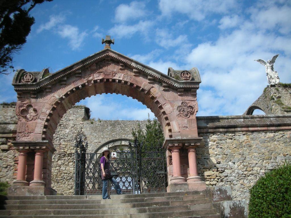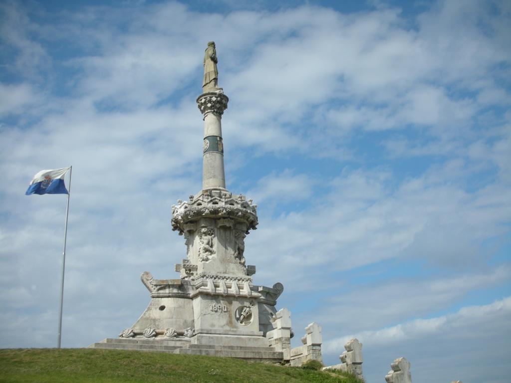 この墓地は、バルセロナのモデルニスモで有名な建築家であるリュイス・ドメニク・モンタネーにより、ゴシック教会の廃墟を改装されたものだそうです。この入り口のアーチや尖塔、十字架、天使の像などの飾り付けが施された様です。この天使はガウディの協力者だったホセ・リモナという彫刻家によるもの、大理石で作られたコミーリャスのシンボル的なものらしいです。その近くの丘に建つコミーリャス侯爵の記念碑(Monumento al Marques de Comillas)、これもリュイス・ドメニク・モンタネーによるものだそうです。