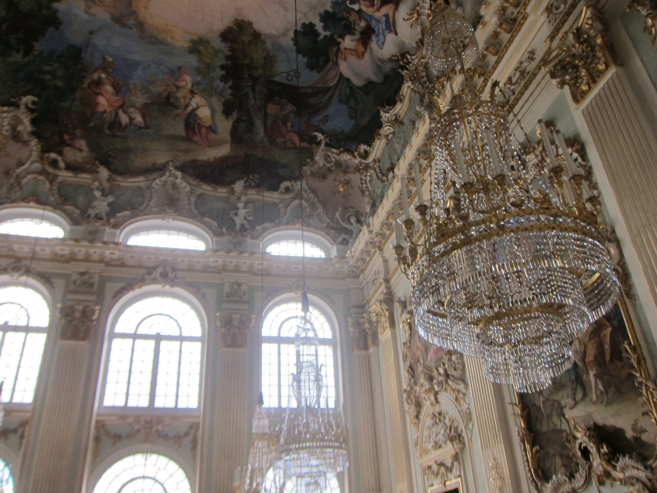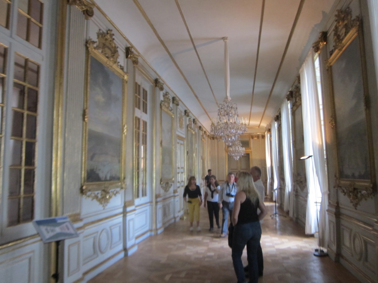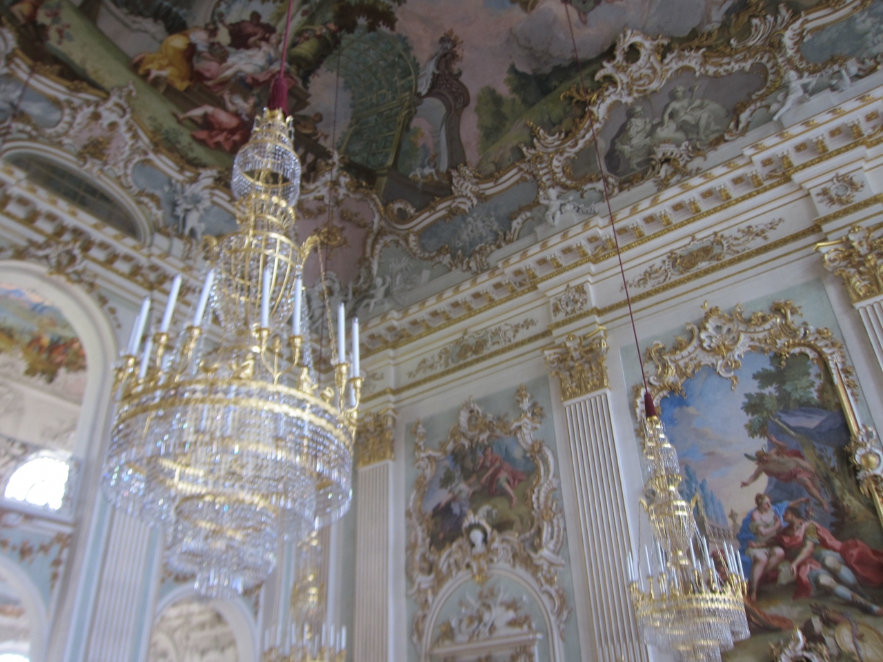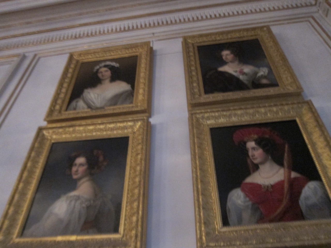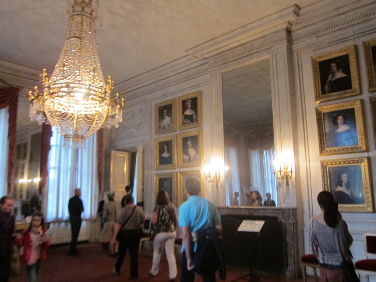 ミュンヘン中央駅の北側から17番のトラムでAmalienburgstr.方面へ20分程度乗ると、SchlossNymphenburgの停留所に着きます。そこから広大な庭園を10分少々歩きます。中央の建物に入り1階でチケットを購入し、2階へ上がります。1階はミュージアムショップのようになっていてロッカールームやトイレなどもあります。2階は舞踏会が開けそうな天井画とシャンデリアの素晴らしい大広間など幾つかの部屋を見学できます。建物右翼側の方の見学範囲の一番奥に美人画の部屋がありました。1階のショップで幾つか絵葉書が売られていたので気に入った方のを購入されてはいかがでしょうか。