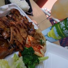 チキンが4枚・ご飯2スクープ・サイドの付け合せが4種類くらいで12ドルくらいでした。1人では食べきれない量です。
