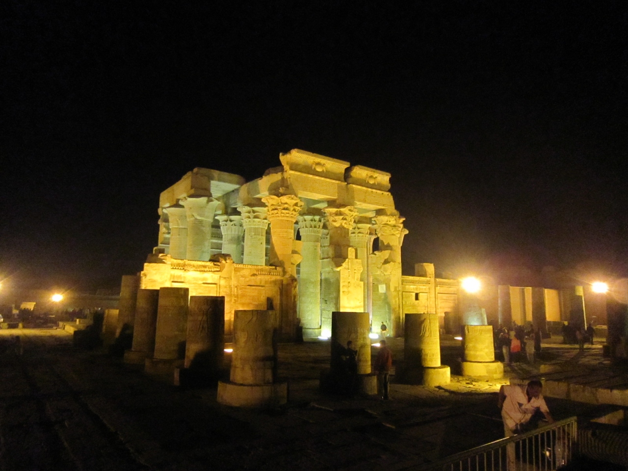 日没ごろ下船し、上り坂をしばらく歩くと夕暮れのなかにライトアップされているコムオンボ神殿があらわれた。なんと神秘的で美しいことか。現地ガイドが壁に描かれたレリーフの意味を細かく説明してくれたが、その内容より暗闇にライトアップされた神殿遺跡を見るのは始めての経験で、神秘的な姿は実に素晴らしく強く印象に残りました。