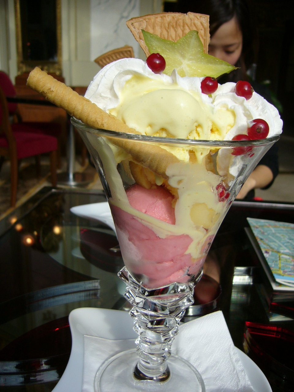 バックパックの貧乏旅行にもかかわらず、ガイドブックでこのカフェを発見し、絶対行ってみたい!と思い、ドキドキして店内へ。ブタペスト内の他のカフェよりは明らかにお値段は高いと思いますが、日本と同じくらいじゃないでしょうか。あの素敵な空間でパフェを食べて、幸せな気分でした♪