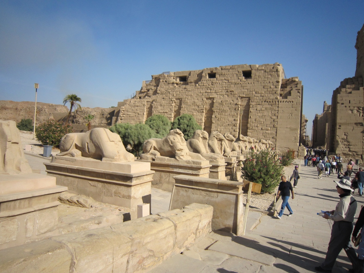 昼食後まずカルナック神殿に向かった。カルナック神殿は巨大な石造遺跡で期待以上の凄さだった。羊頭スフィンクスが両脇にずらりと並んだ参道を進むと巨大な塔門があり、その先には100本以上もある太い列柱が整然と並ぶ。列柱の上に載っている梁に描かれたレリーフには未だ色が残っていた。30mもあるオベリスクも素晴らしかった。