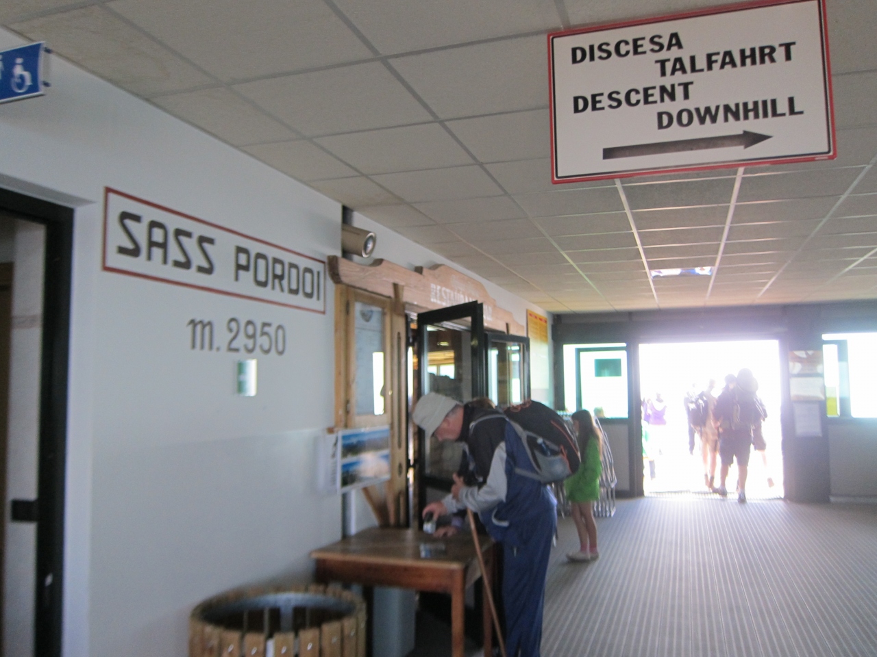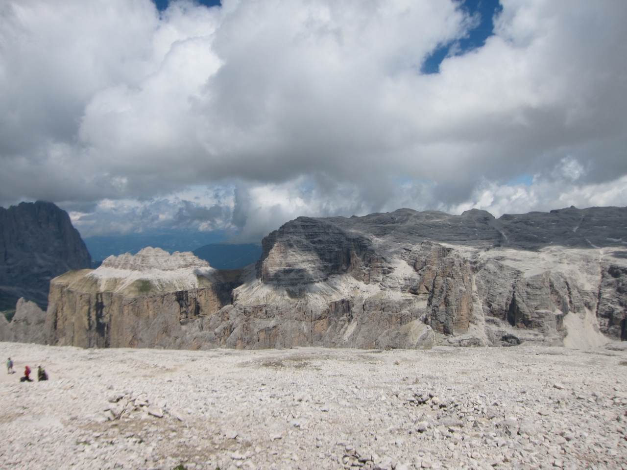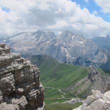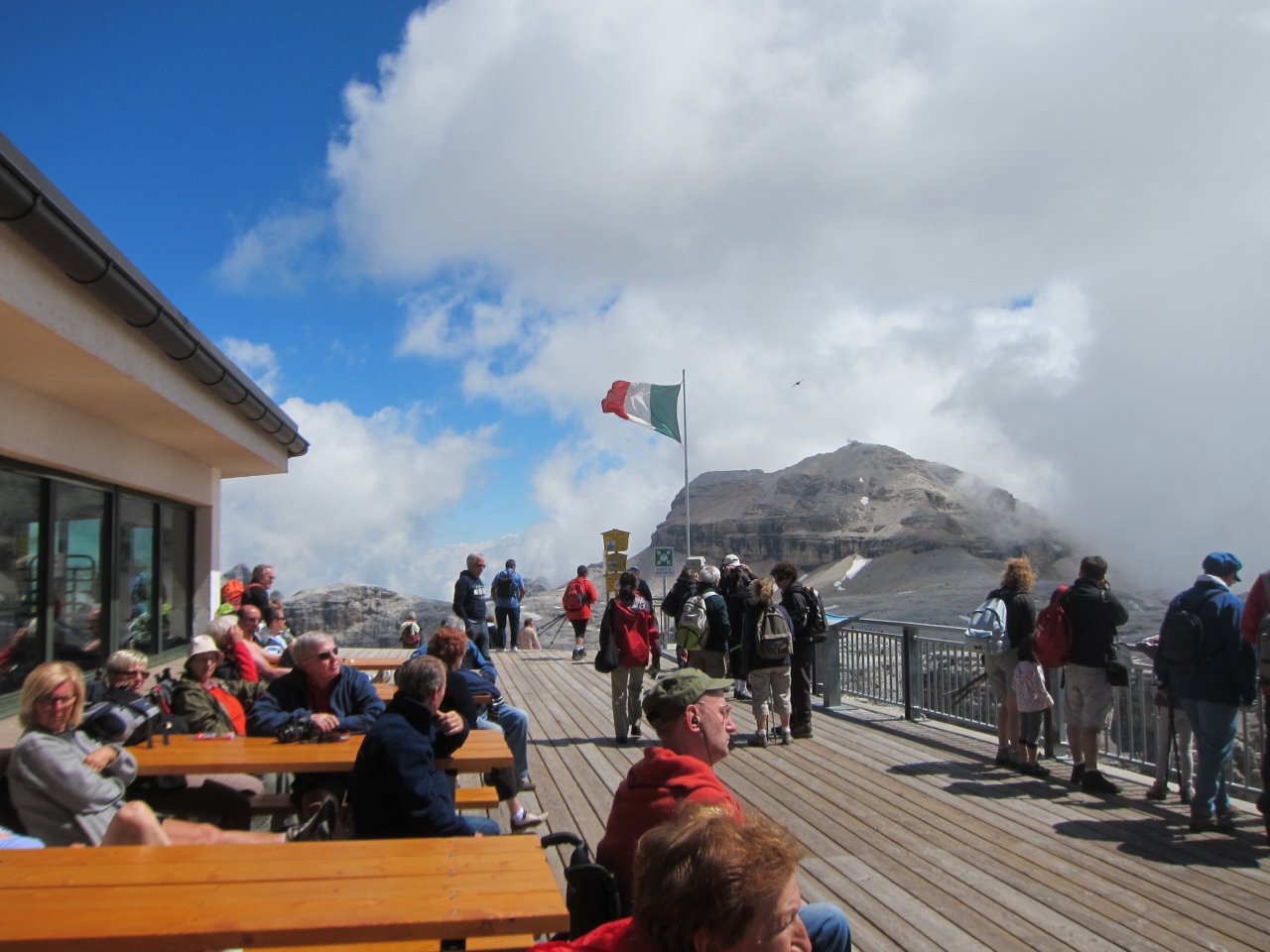 ポルドイ峠からのロープウェイ(Funivia)で山頂(2950m)まで行けます。麓の駅もそうですが、山頂のロープウェイ駅にはレストハウスが併設されていて、食事ができます。夏場でも寒いときがあるので、冷えたら中で食事をとりながら休むとよいと思います。外には無料で休めるデッキ席がありますが、夏でも上着がないと寒いときがあります。山頂は台地状になっていて(やや傾斜はありますが)比較的平坦で、マルモラーダ山、麓のポルドイ峠とヘアピンカーブの道、カナツェイの街、サッソルンゴ、セッラ山塊、ボア山など360度見渡せます。台地の端は麓まで数百mある断崖の絶壁になっていて、駅から離れると柵とかは無いので注意が必要です(クライマーの人もいましたが)。山頂からはボア山や麓までのハイキングコースがあり、時間があったら歩いて下りてきてもよいと思います。ポルドイ峠までのアクセスは、ボルツァーノからだとコスタルンガ峠、ヴィーゴ・ディ・ファッサ、カナツェイとバスを乗り継ぎます。その他、ファルツァレーゴ峠を越えてコルティナ・ダンペッツォからのルートやセオルティセイからのルートがあります。バスの本数がかなり少ないので計画的に。ちなみにタクシーだとポルドイ峠~コルティナ・ダンペッツォは約1万円(1ユーロ=ほぼ100円)でした。