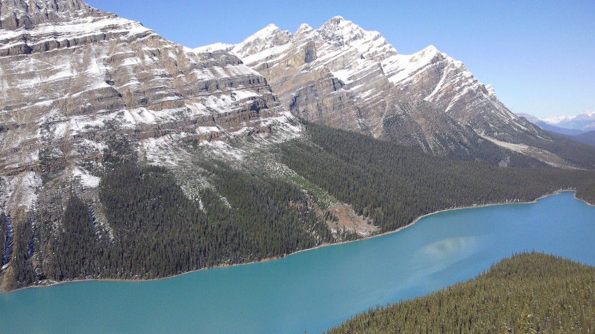 ペイトレイクはバンフからコロンビア大氷原へ向かうツアーの途中に立ち寄るスポットの一つです。湖は氷河に削り取られた山々のふもとに細長く広がっていて、端の方が手の平のような形になっています。訪れた時は湖に下りる道に雪ががちがちに凍っていて転びそうで危ない感じでしたが、湖が見下ろせる展望台に降りて眺めた景色は印象深いものでした。途中木の上の方でリスがかつかつと音を立てて鳴いていて自然豊かなロッキーの山々と湖を楽しめます。