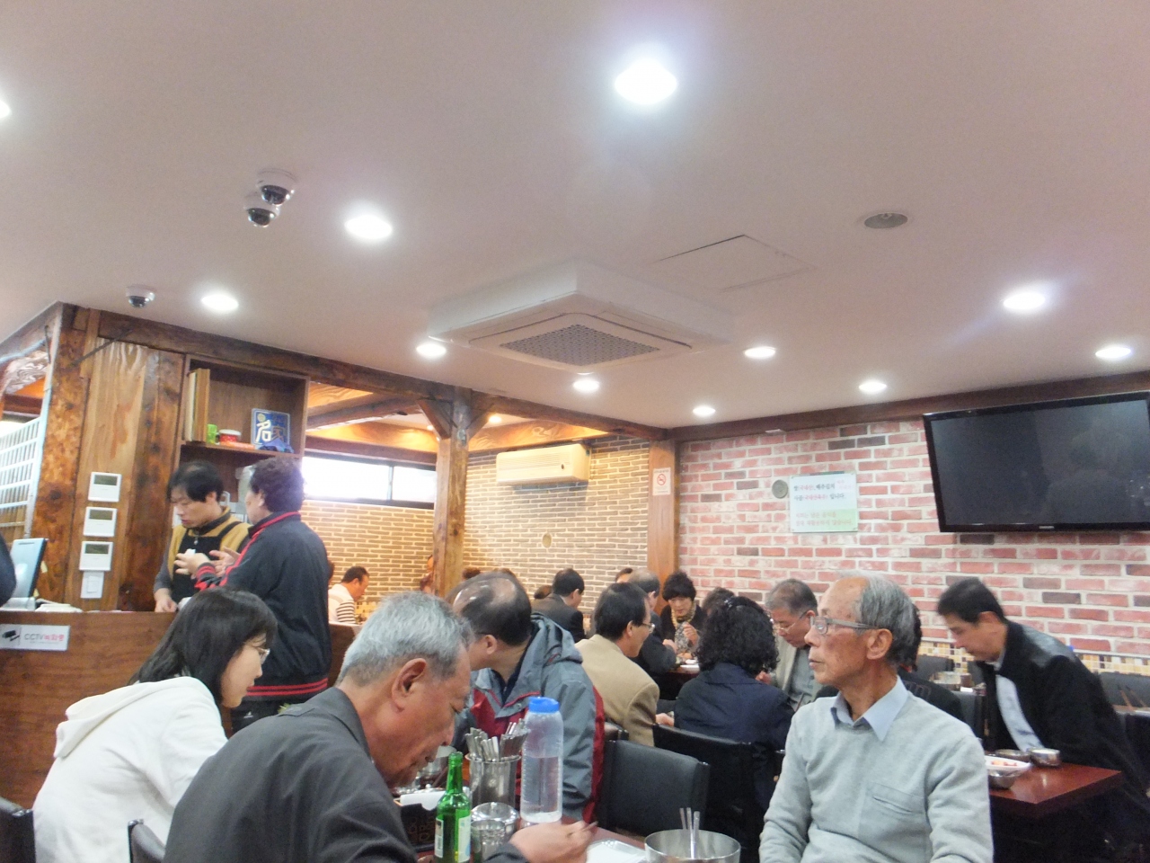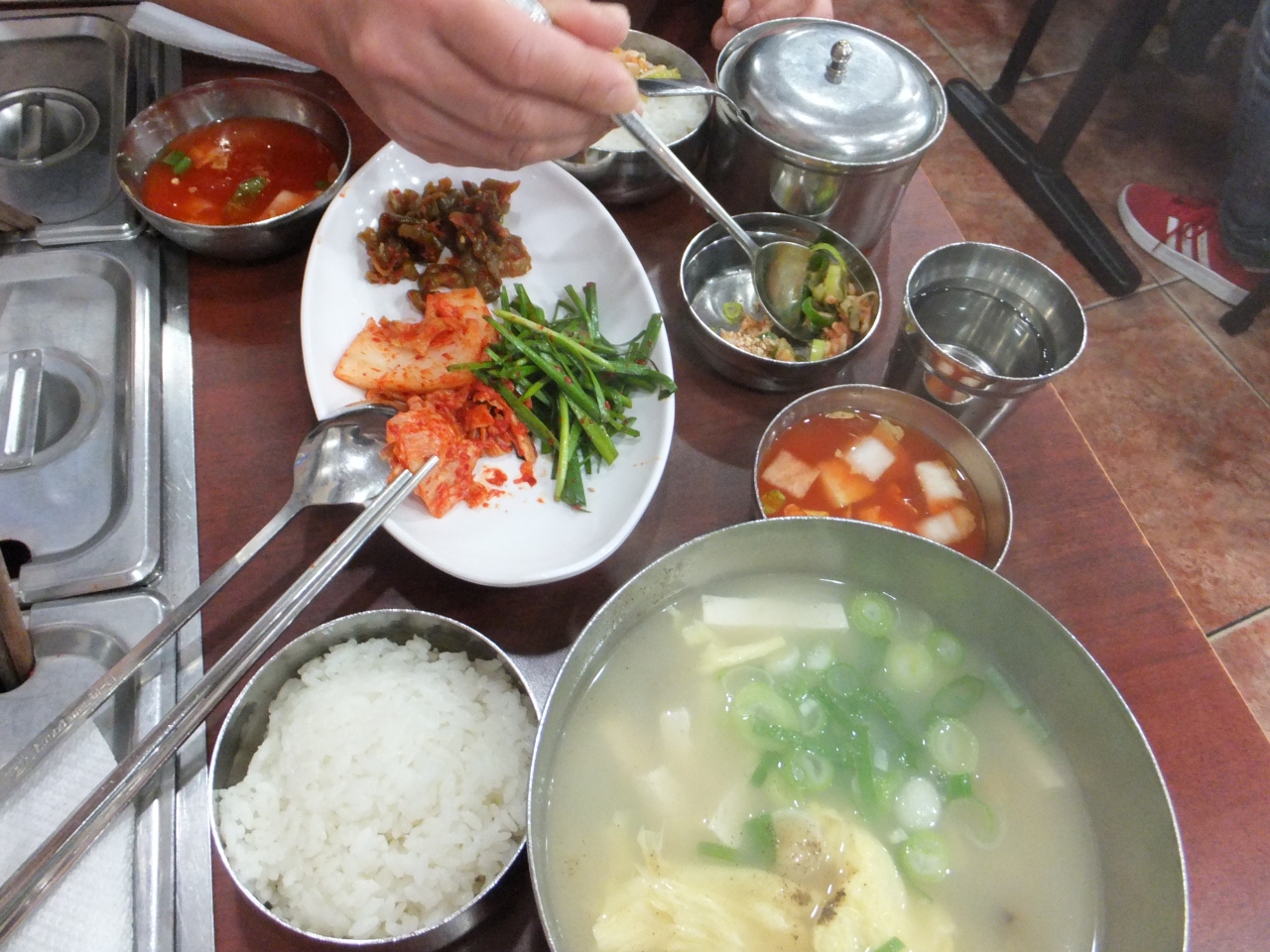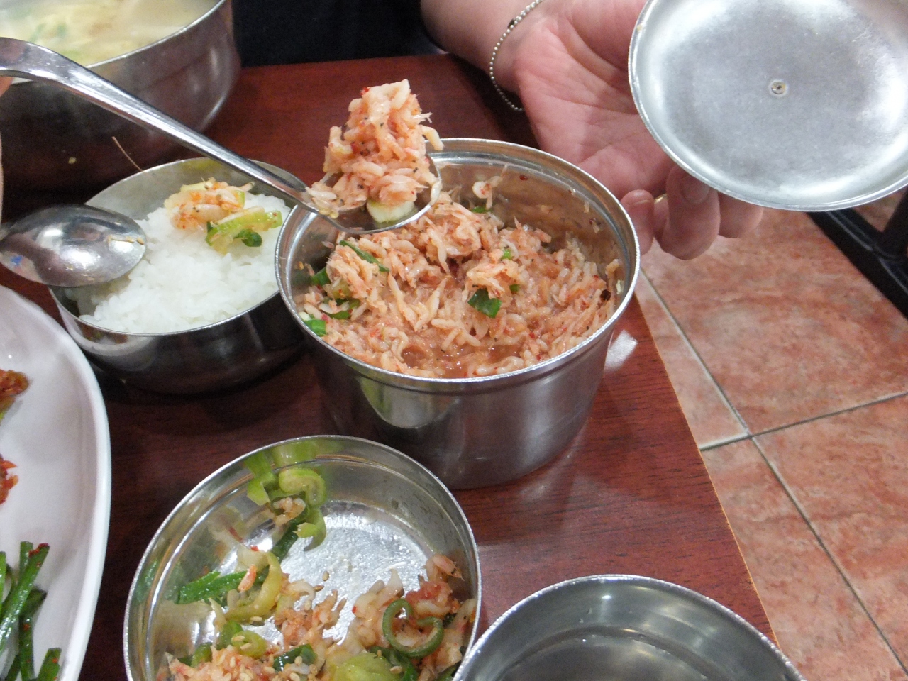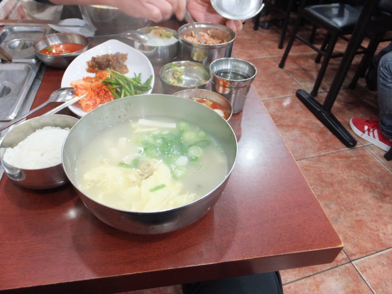 厨房では大量のスープを次々と器に投入。テーブルにつくと、まず付け合せの、キムチ類、アミ(エビ)の塩辛,エビのふりかけ、ご飯がきて、程なくスープが来ます。
