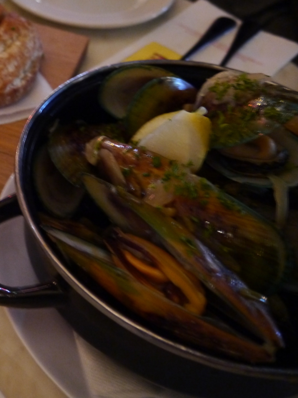 ガーリックで蒸したムール貝のハーフ?と生ガキをハーフ?とガーリックパンを注文しました。