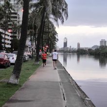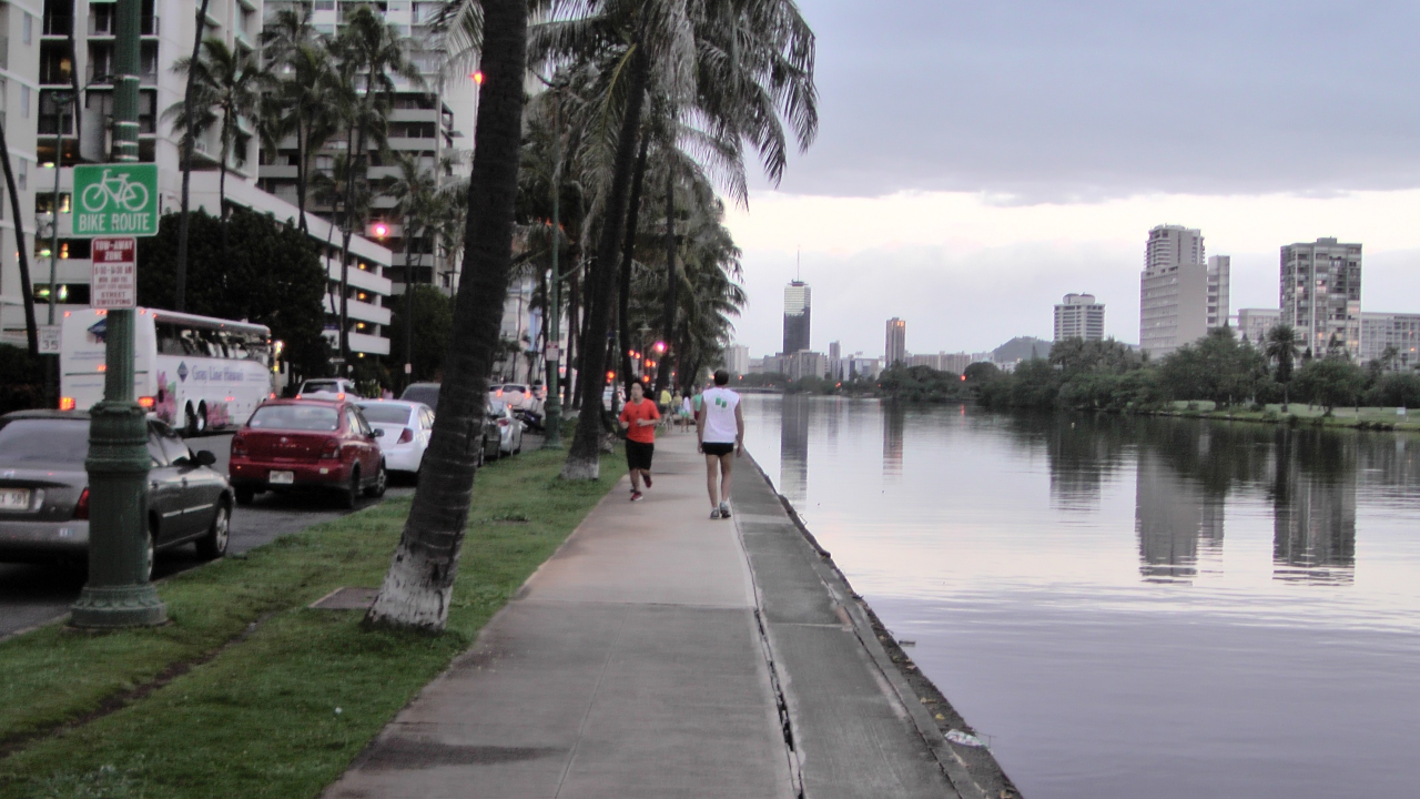 アラワイ運河は朝の散歩、ジョギングコースとして最適です。あまり河はキレイではないですが、椰子の木の隣を、散歩するのにいいです。カラカウア通りは、信号や車の出入りがあるので、散歩も落ち着きませんが、アラワイ運河は、運河側の歩道なら信号もなく、直線で2Km以上あると思います。