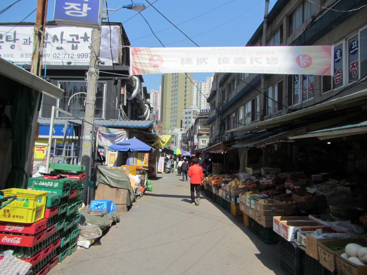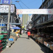 地下鉄孔徳駅から歩いて3分程度です。豚足のお店と天ぷらのお店が有名です。e-Martやロッテマートでは無い普通のスーパーもあります。豚足は豚足通にあります。天ぷらのお店は、通路の真向かいに2軒あります。駅から行くと手前の店が元祖で、並べられた天ぷらに日本語の説明も書かれています。天ぷらは、ざるに好きなだけ取って、会計するシステムです。商品には、市場には珍しく値段が書かれています。明朗会計で安心です。エビ天800W.げそ天500Wでした。取った天ぷらは、もう一度揚げて温め直してくれます。持ち帰りも、店で食べることも出来ます。残念ながら日本語は通じませんが、身振り手振りで、なんとか通じます。