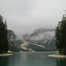切り立った山岳に囲まれた静かで神秘的な湖です。行った日は小雨がぱらつき、山には雲がかかる、あいにくの天気でしたが、それはそれで雰囲気があったと思います。曇りなのにエメラルドグリーンの湖面と白砂の浜が映えていました。湖は一周できる散策コースがあり、多少の起伏はありますが、あっても10~20m程度です。意外と時間がかかるため、最低でも1時間はとった方がよいと思います。入口のところに20~30台止まれる駐車場とバス停があります。併せてレストハウスとお土産屋、トイレなどの建物があります。入口から左手に進むと湖上の休憩小屋があります。右手は教会です。皆、左手から回って一周していました。奥まで行くと白砂の砂浜にでます。アクセスですがDobbiacoのバスターミナル(Dobbiacoの駅の北、約1kmあたりのところ)がらバスで30分くらい、終点で下車です。