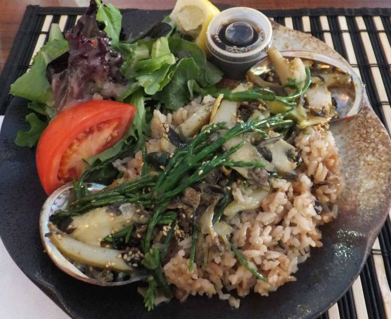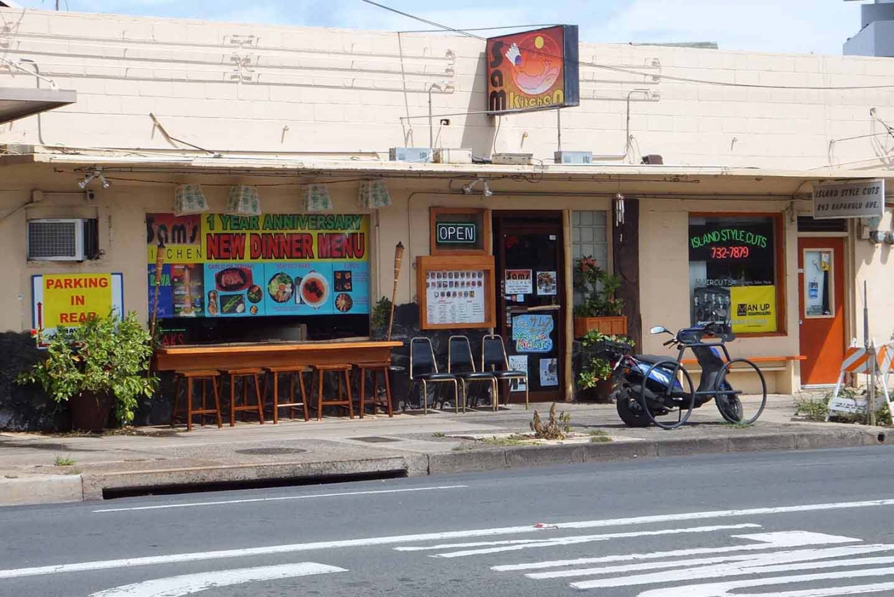 カパフル通りを北上して、レナーズベーカリーの少し手前に2011年にオープンしたお店。CS放送の「アロハ天国」は毎回欠かさずに見ていたので勝手にサムさんに親近感を持ち、ワイキキ店に続いて、カパフル店にも訪れました。カパフル通りの北の方は、それまではバスでは行きづらい場所だったのですが2012年に13番バスがクヒオ通りからカパフルを左折して北上するようになり、レンタカーを利用しない我々でも行きやすくなりました。(そのまま乗っているとハワイ大学にも行けます。)料理の方は、さすが日本を知り尽くしたサムさんの味です。繊細な味付けと、何よりごはんがおいしい!絶品のあわび炊き込みご飯とガーリックシュリンプを食していたら、なんとサムさんがやって来たのでいろいろお話しました。通訳なしでお話ができることがうれしかったです。(笑)