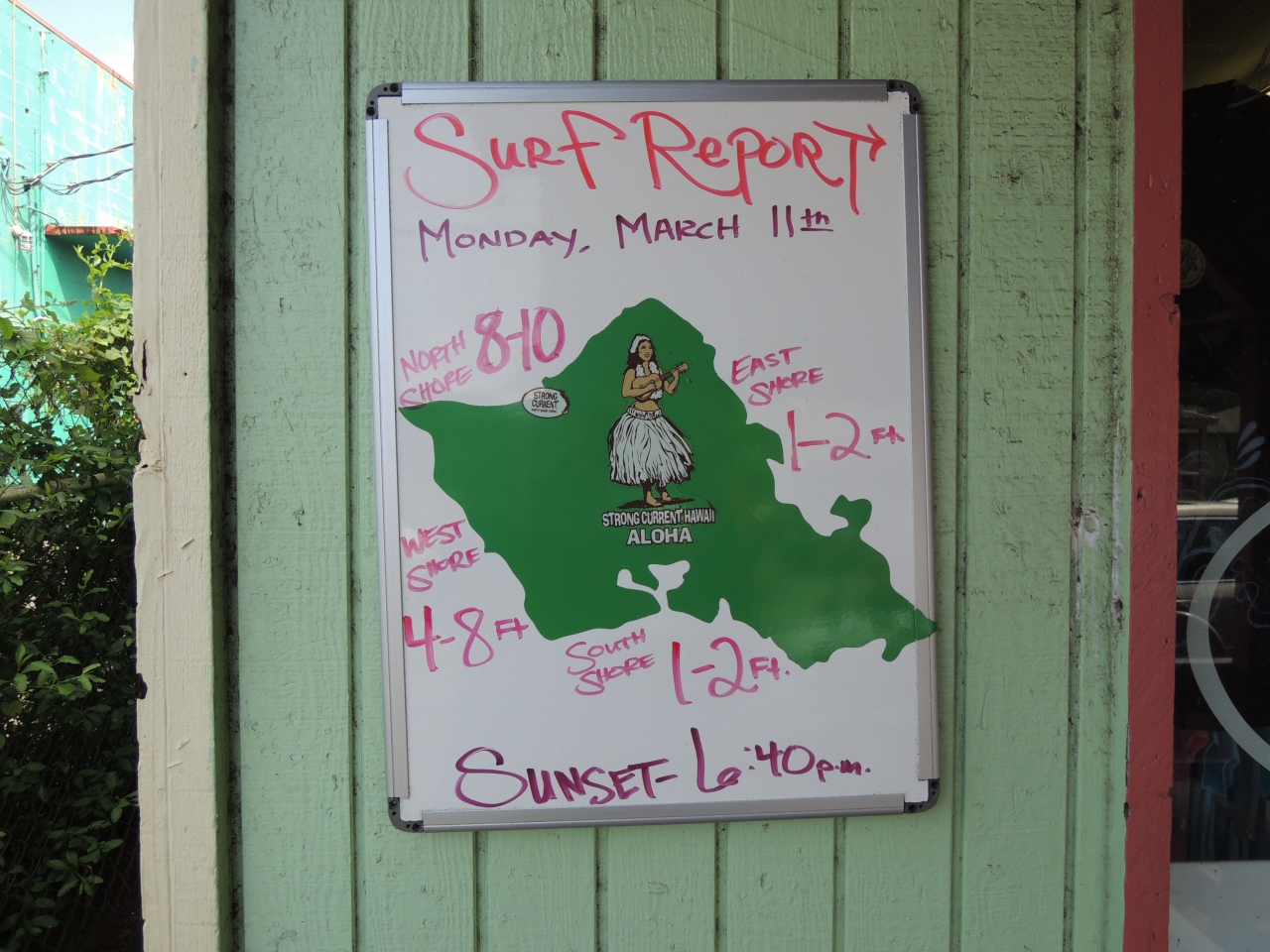 外の小汚いテーブルに座ると、横には本日のサーフ・リポートのボードが。これが「ノースショア」っぽくてイイ感じでした。