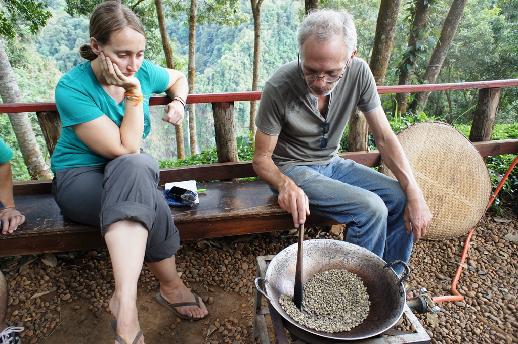 滝を観るのも目的の1つでしたが、今回はこの滝の所でやっているコーヒーワークショップに参加するのがメインでした。タート・ファーンの辺りはボラベン高原と呼ばれており、ラオスコーヒーの一大産地となっています。滝までの道すがらにも、沢山のコーヒー農園がありました。そして、ここでは午前中は農園見学のコーヒーツアー、午後からはコーヒー豆を実際に焙煎してみる体験がセットになった、コーヒーワークショップをやっています。コーヒーが好きでラオスに住み着いたオランダ人(確か)Mr.Coffeeがやっているのですが、コーヒーにまつわるお話も沢山聞けて、また実際に焙煎したコーヒー豆はお土産として頂けるので、とても充実した1日を過ごす事が出来ました。Mr.Coffeeは韓国のTVに出た事があるらしく、訪れていた韓国人観光客には写真を一緒に撮らせて、と求められていました。
