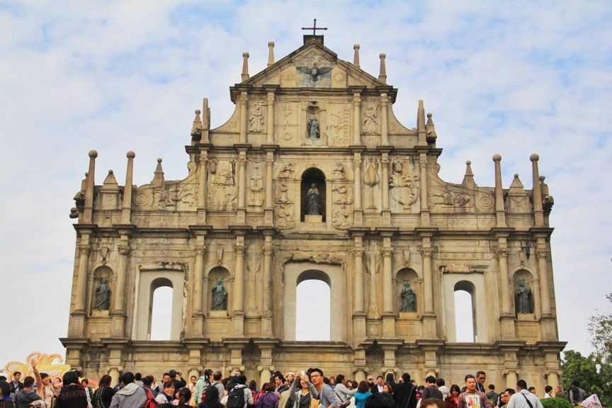 聖ポール教会はイエズス会によって1602年に創建された教会。1835年の火事で教会の前壁と68段の階段だけが残された。。残存するファザードから当時の美しく壮大な姿を想像するのも楽しみの一つ。観光客だらけで騒々しいのがちょっと残念。
