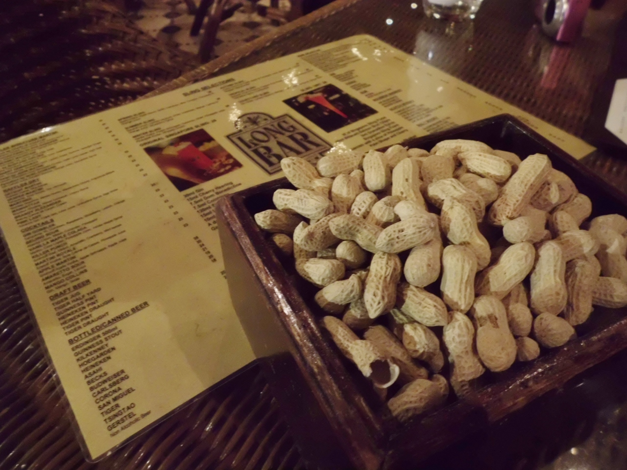 シンガポールスリング発祥の地、ラッフルズホテルのロングバーへ行きました。場所がちょっとわかりにくかったです。2階の端にあり、少し迷いました。机の上には豆まきをするかのような落花生の山がスタンバイ。床が殻のくずで歩くときに滑りそうです。ノンアルコールのカクテルも数種類あります。