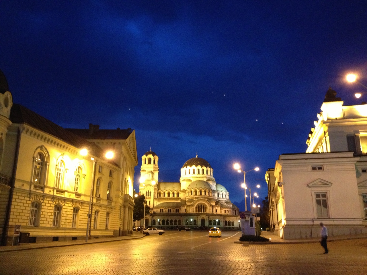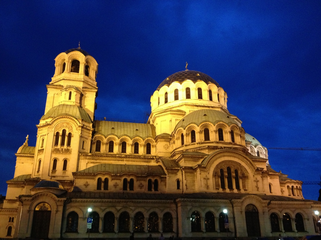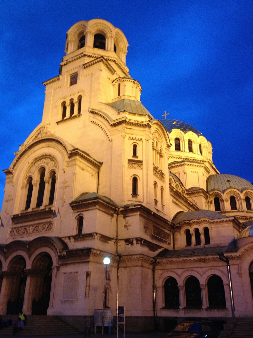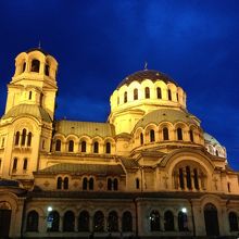 ソフィア22時半頃着の便で上空からライトアップされたアレクサンダル・ネフスキー寺院が見えあまりにキレイだった為、サッと見て帰ろうと20:15くらいからスタンバっていたのですが…すぐ前の国会議事堂は薄闇に染まる頃から早々にライトアップされているのに、寺院はどんどん暗くなって人通りも全然なくなるような頃になっても点灯されず、意地で待ち続けたら完全に暗くなる一歩手前(5/7で20:50頃)にやっとライトアップされました。